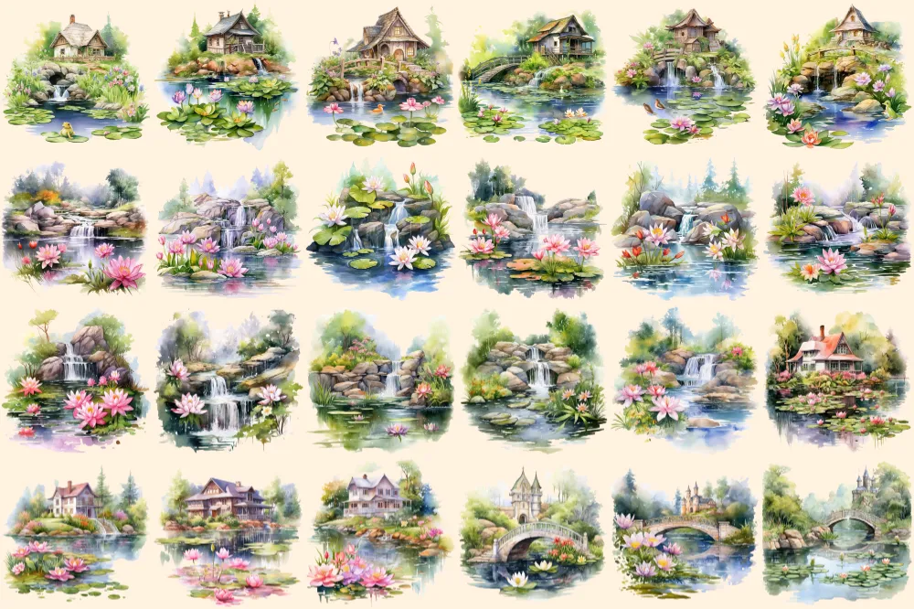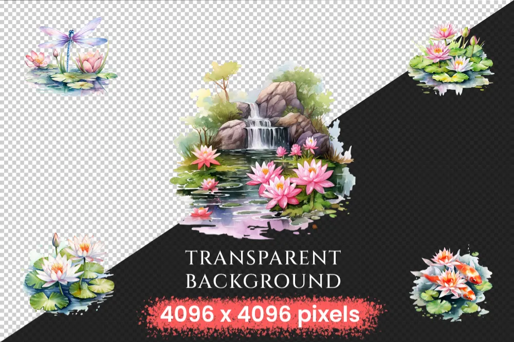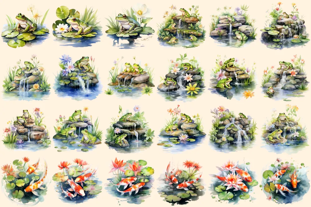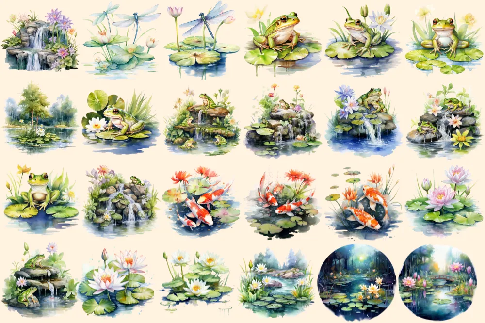 Lily Ponds Watercolor Clipart Bundle – 140+ transparent PNG, Frog pond illustrations, Lovely lily graphics, Commercial use, Digital download