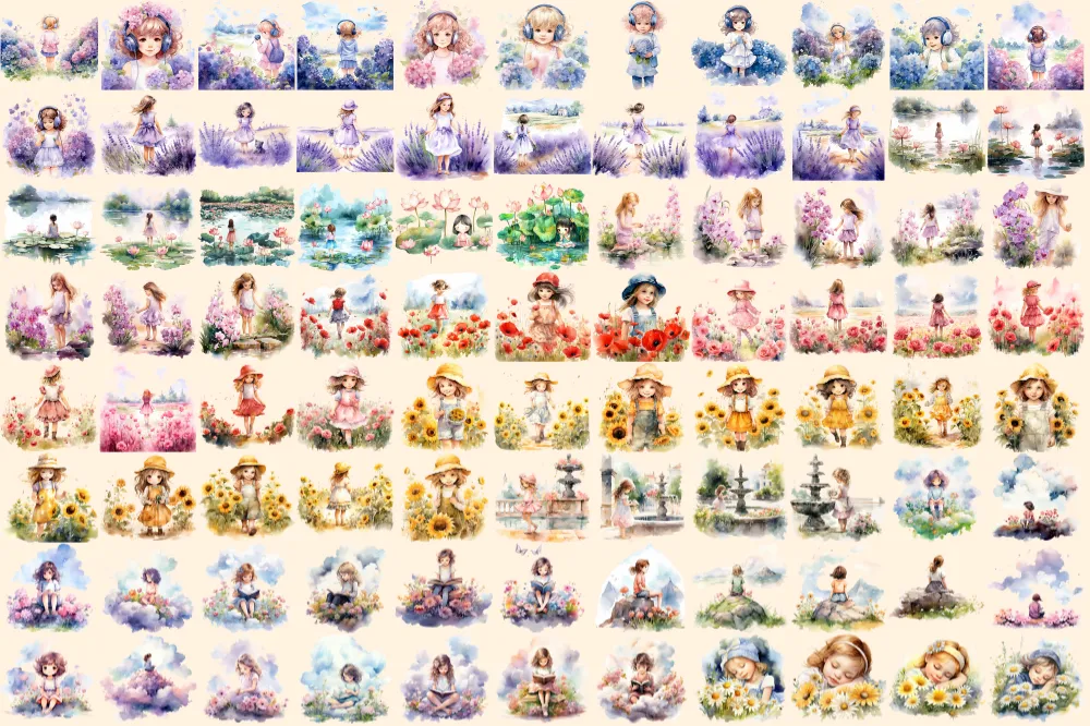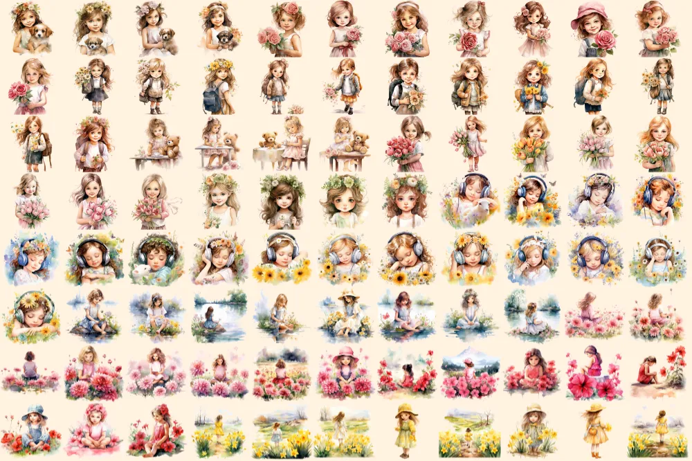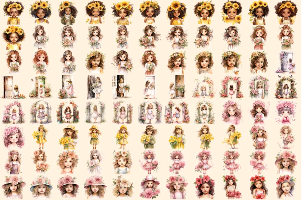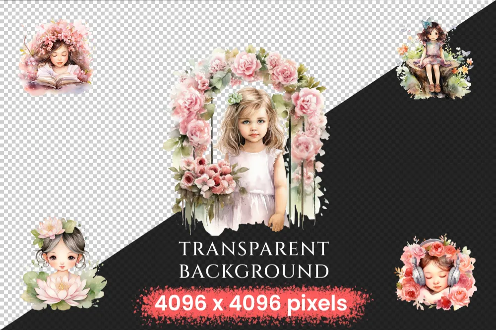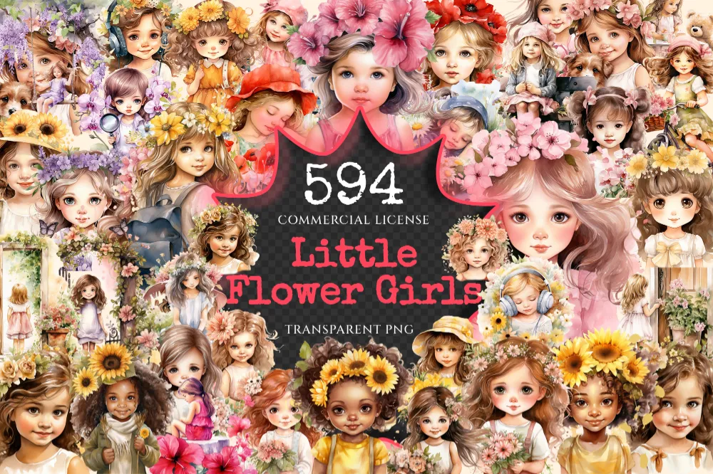 Little Flower Girls Watercolor Clipart Bundle – 590+ transparent PNG, Cute floral girl png, Cute artwork, Commercial use, Digital download