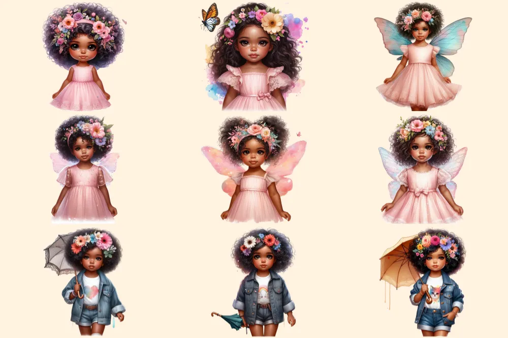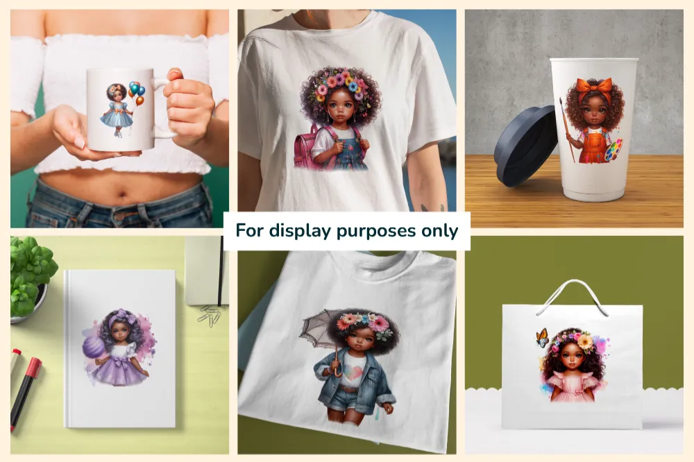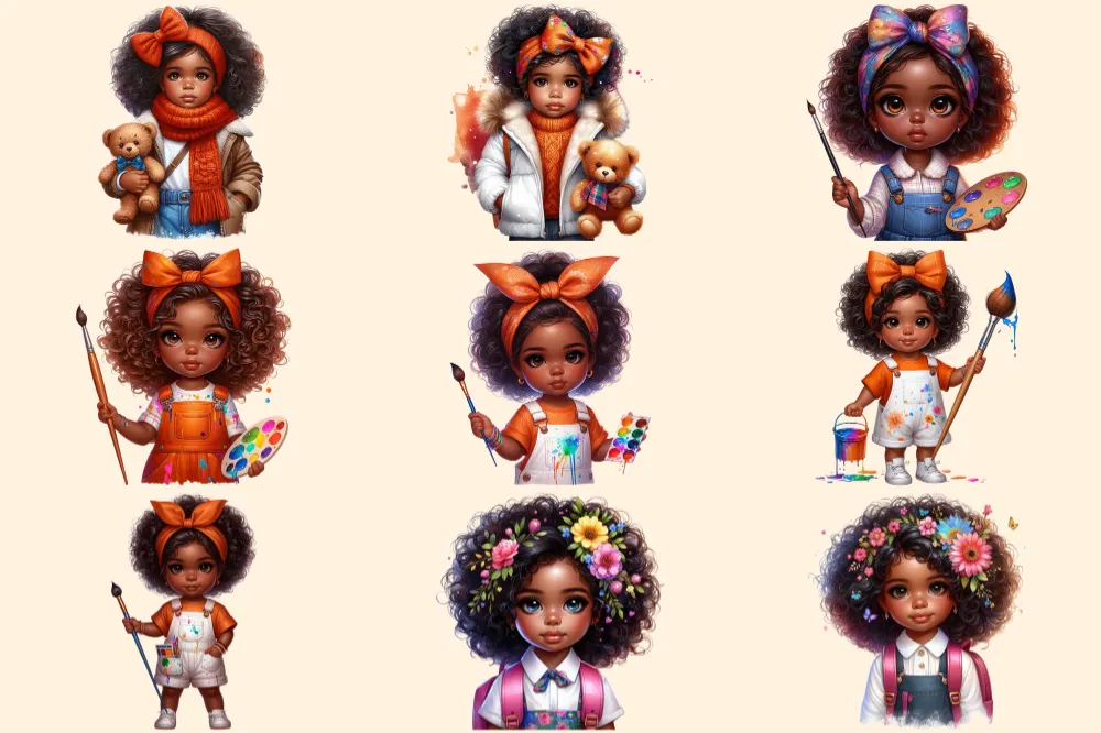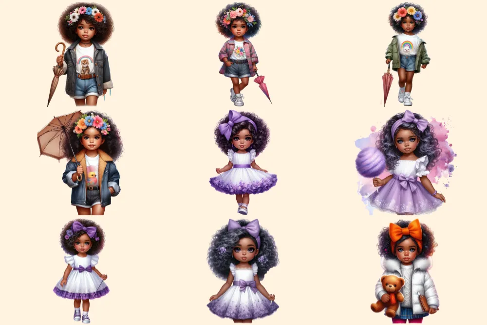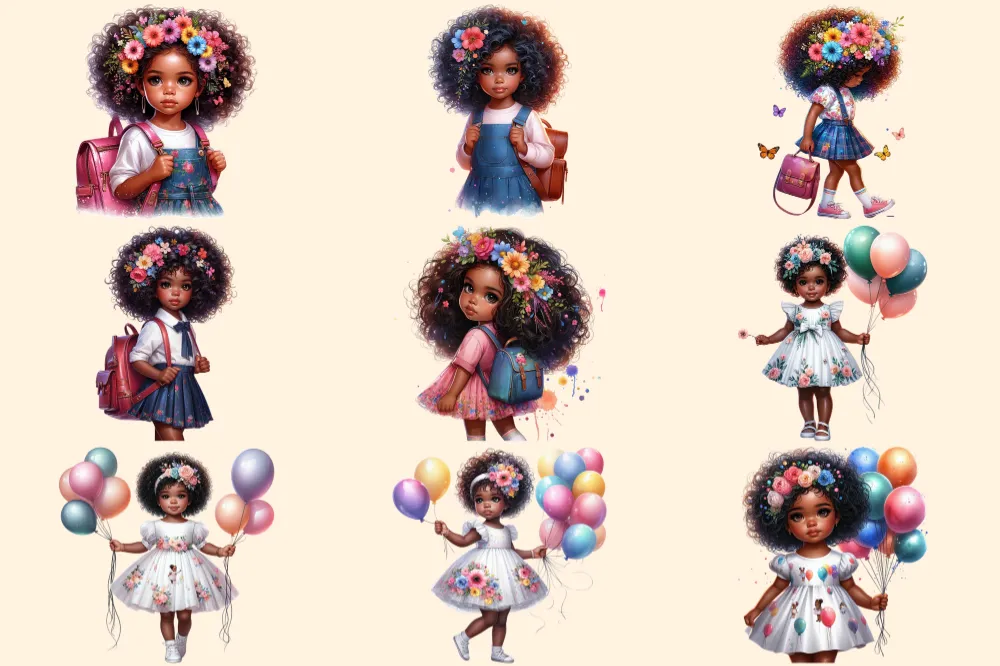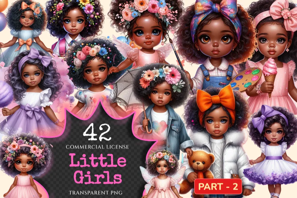 Little Girls (P-2) PNG Clipart Collection – 42 PNG, Adorable dark-skinned girl graphics, African girl png, Commercial use, Digital download
