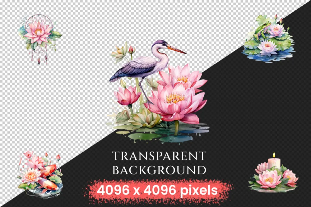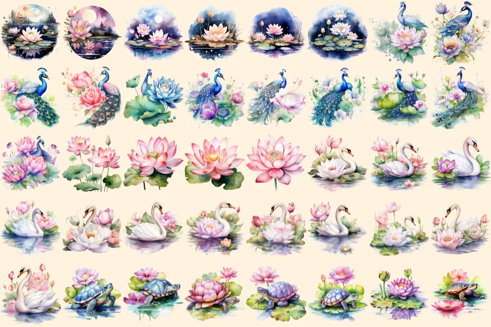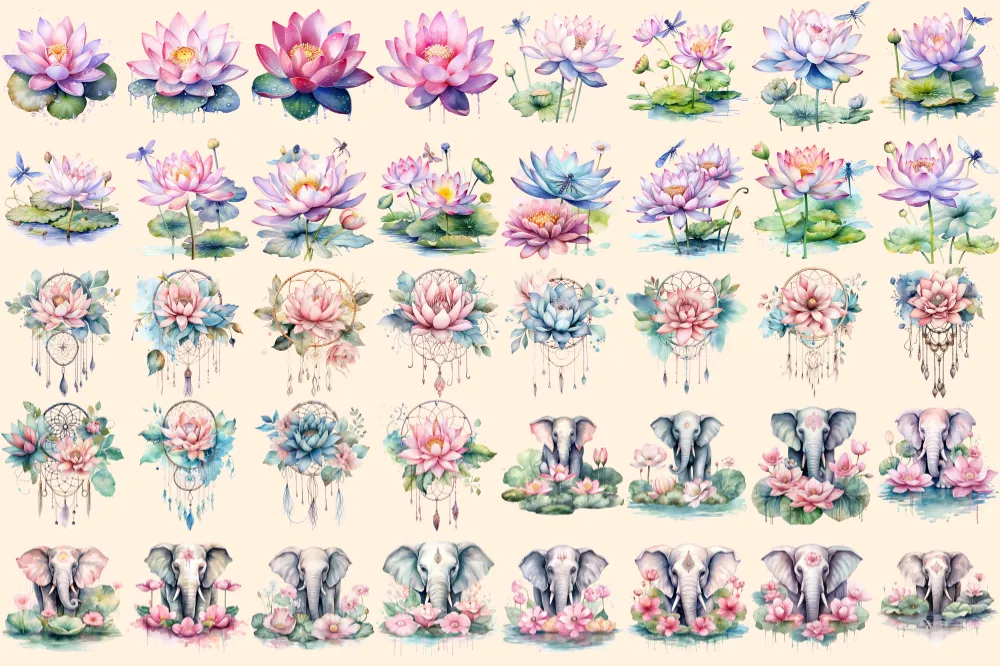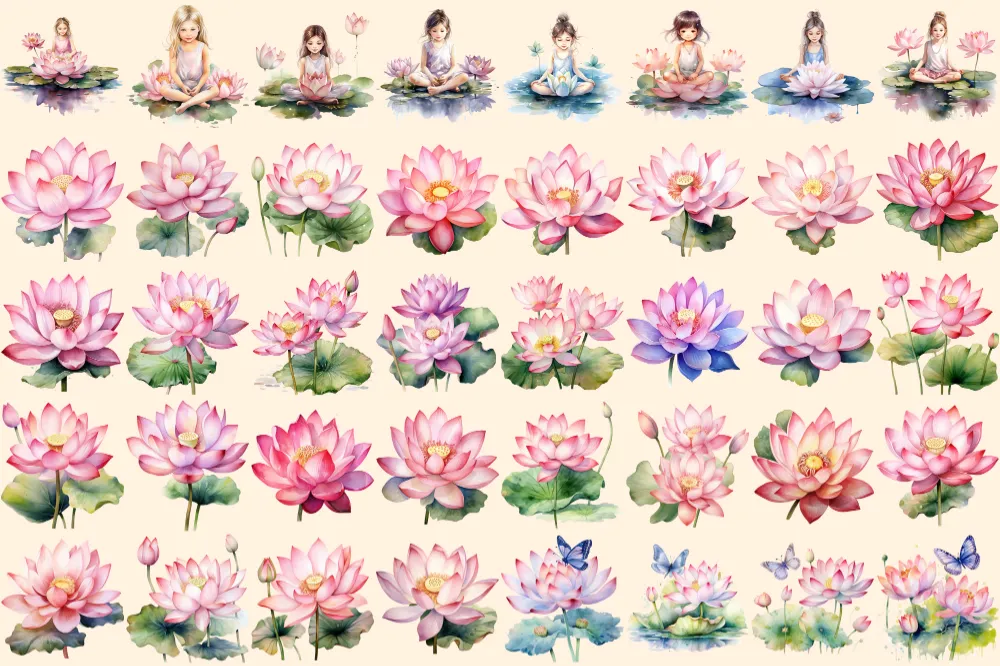 Lotus Flowers Watercolor Clipart Bundle – 250+ transparent PNG, Stunning flower graphics, Blossom images, Commercial use, Digital download