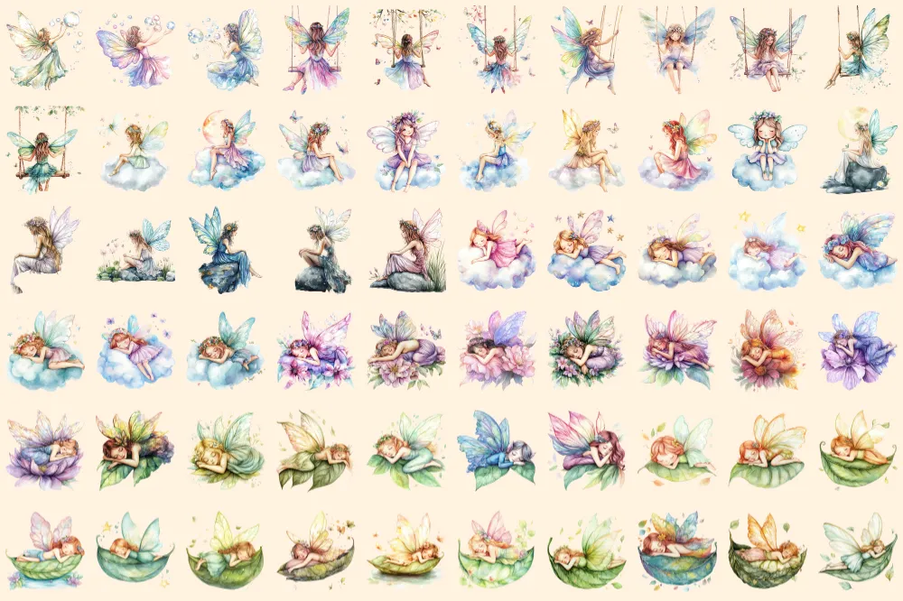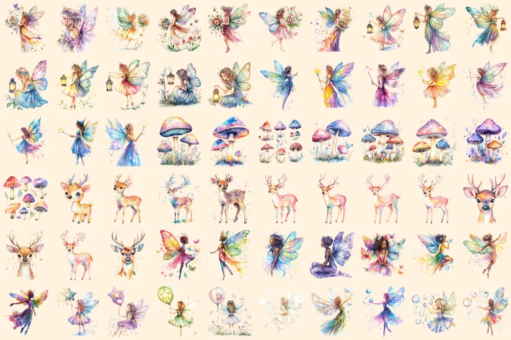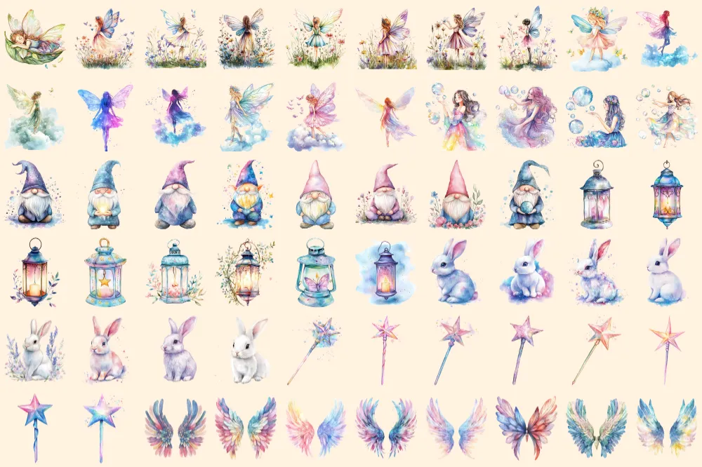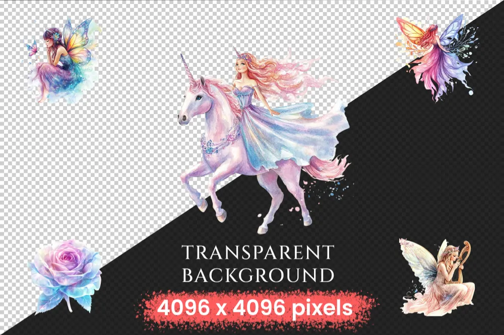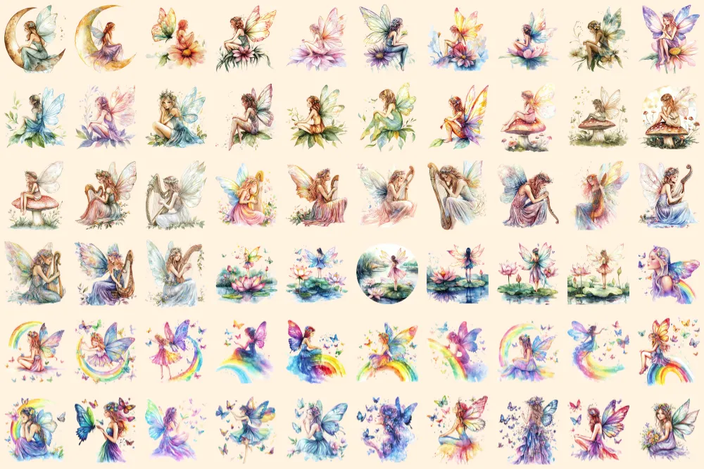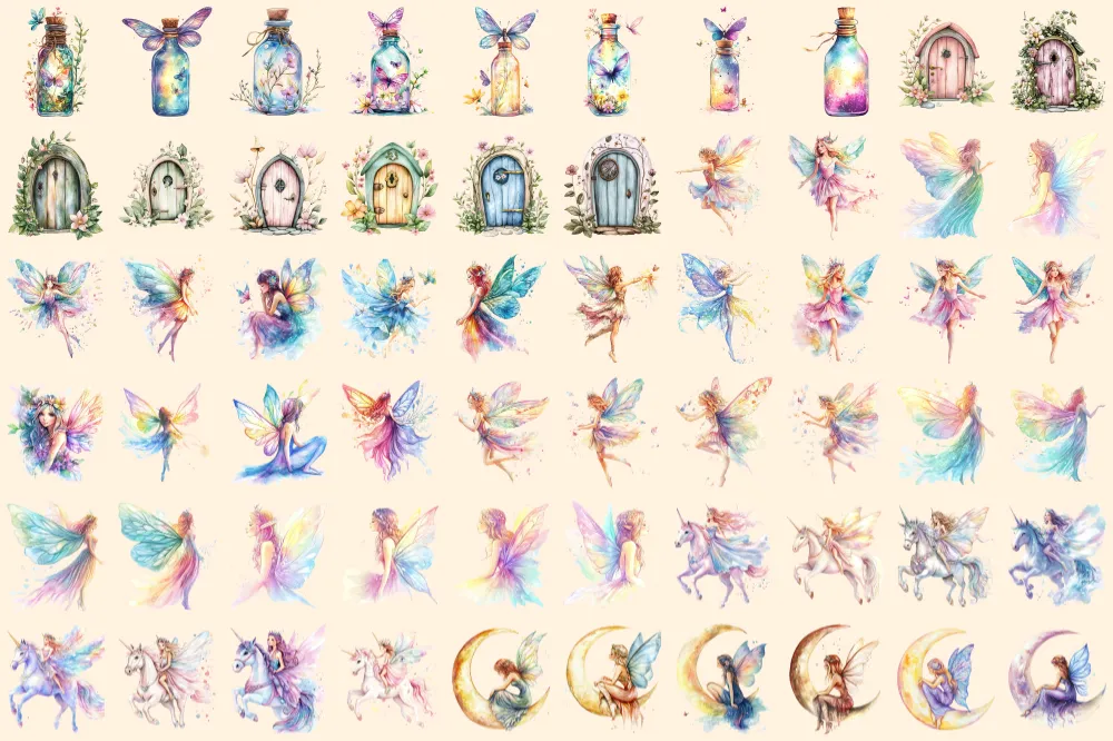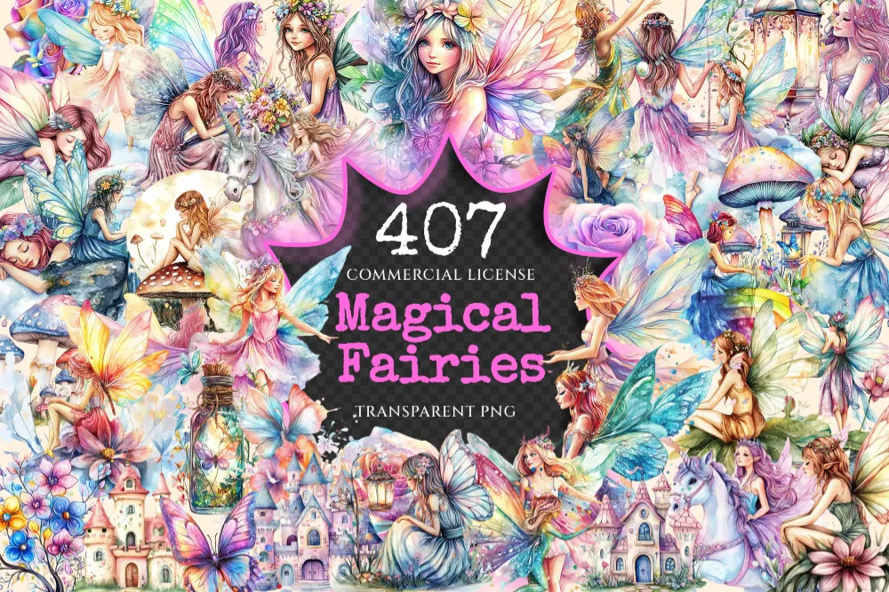 Magical Fairies Watercolor Clipart Bundle – 403+ transparent PNG, Fairy magic graphics, Enchanting images, Commercial use, Digital download