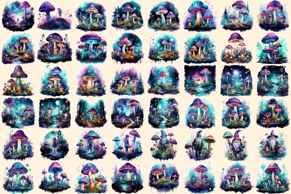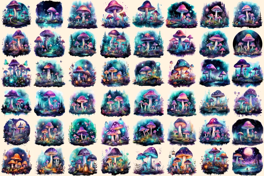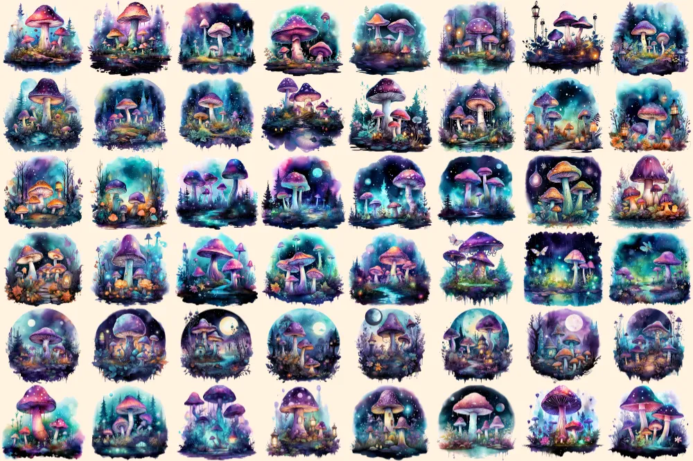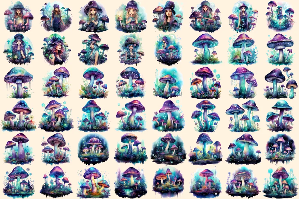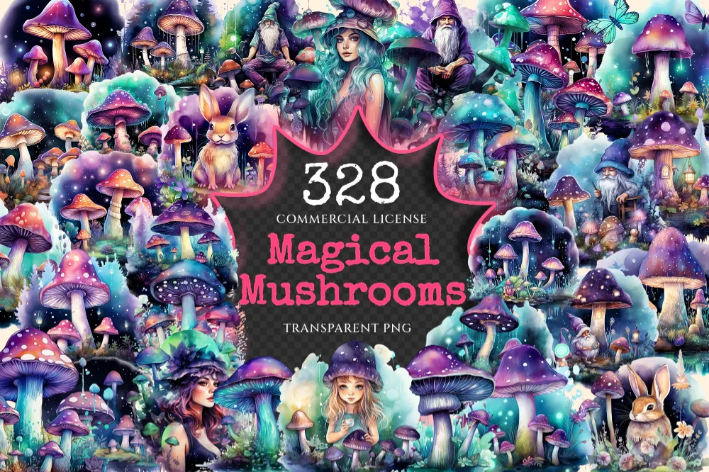 Magical Mushrooms Watercolor Clipart Bundle – 325+ transparent PNG, Luminous mushroom graphics, Fungi png, Commercial use, Digital download
