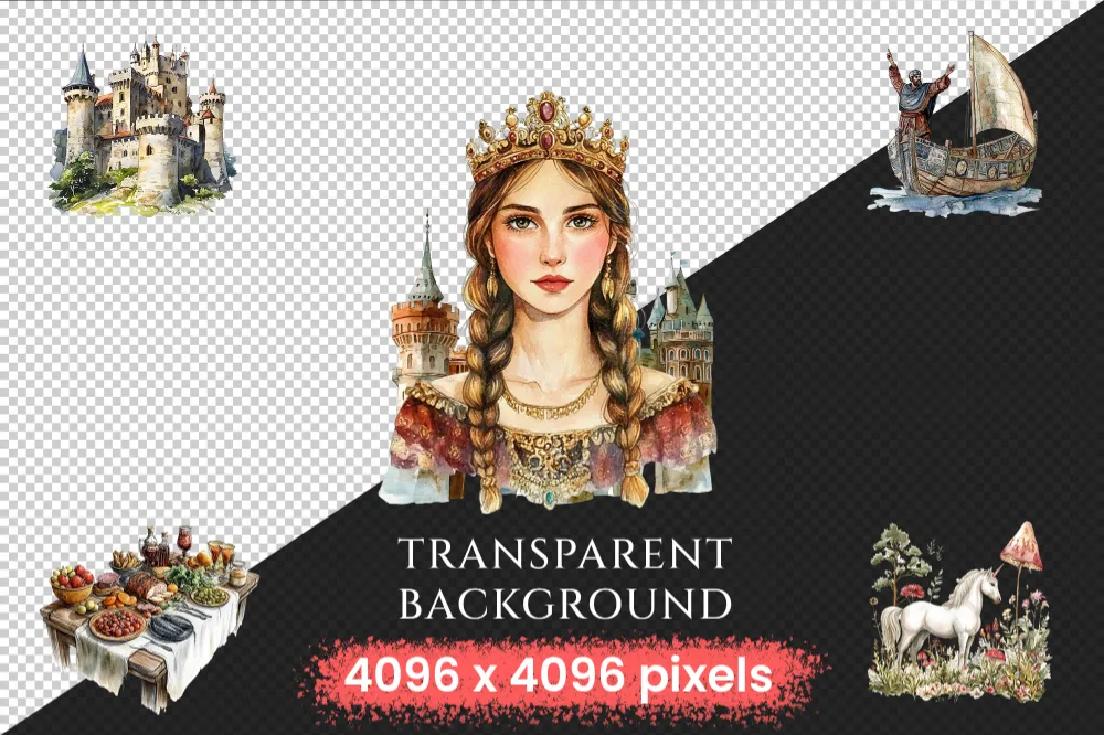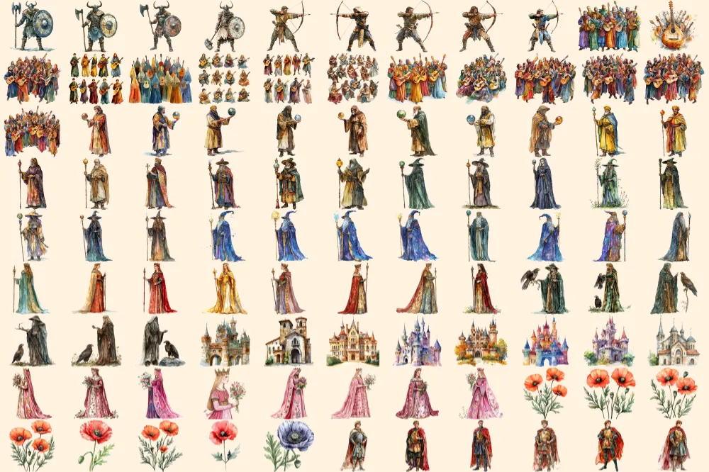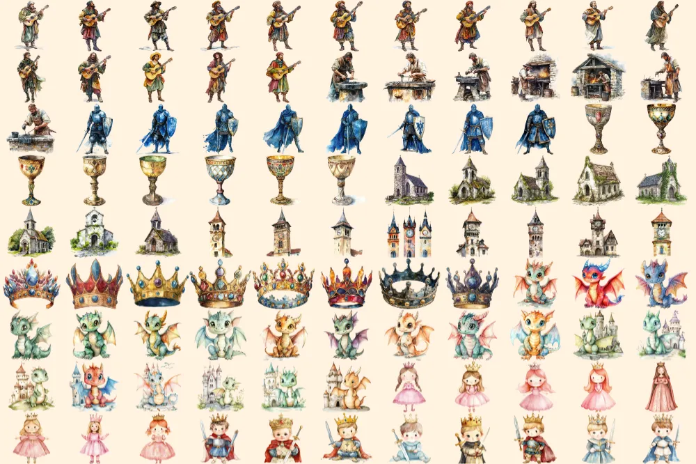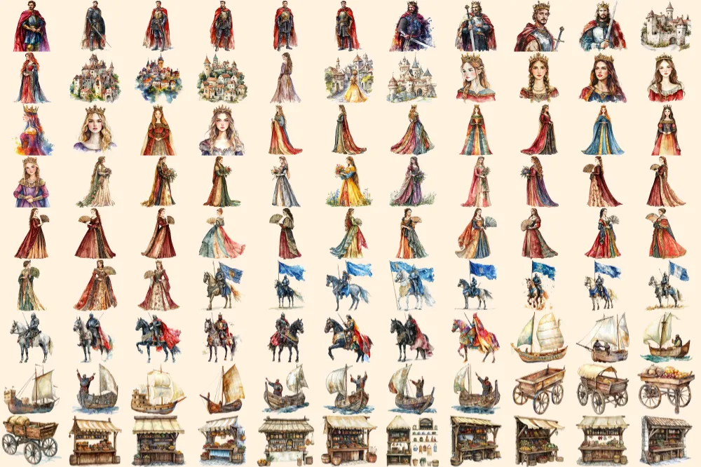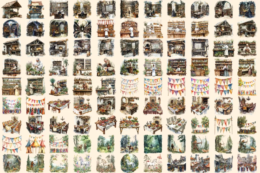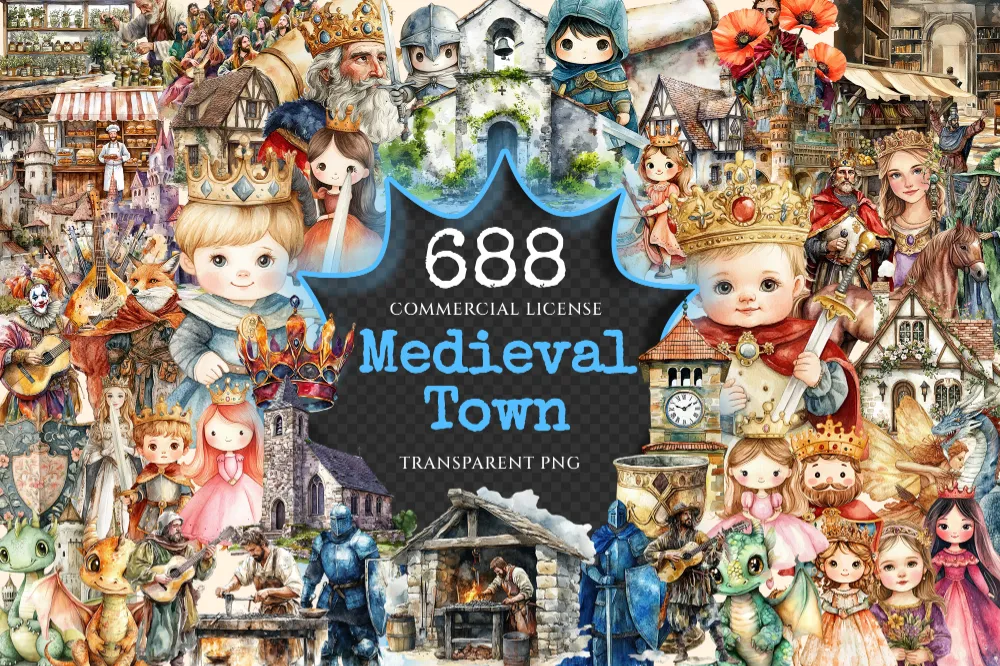 Medieval Town Watercolor Clipart Bundle – 680+ transparent PNG, Old world town graphics, Timeless village, Commercial use, Digital download