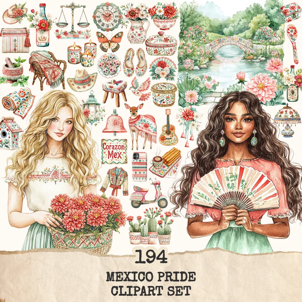 Mexico Pride Mega Bundle – Patriotic Sombrero Printables, Ephemera, Journal, Mexican Floral PNG Clipart, Seamless Pattern, Digital Download