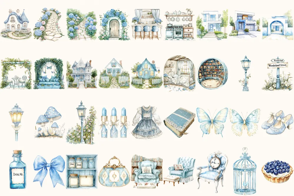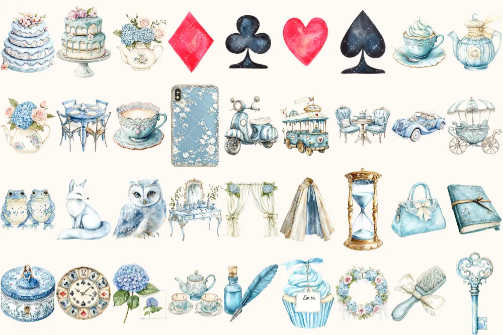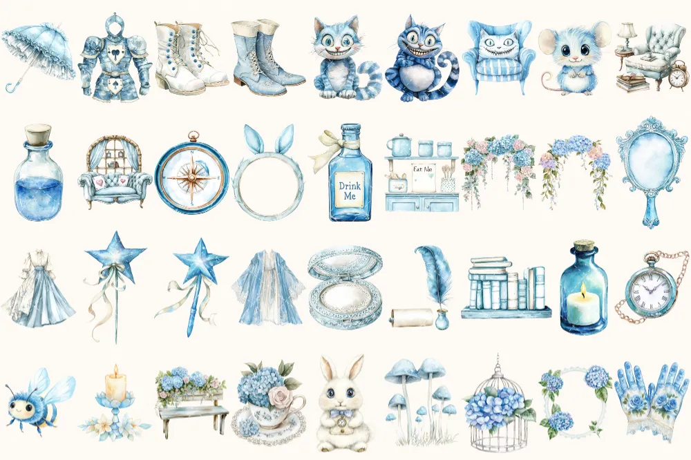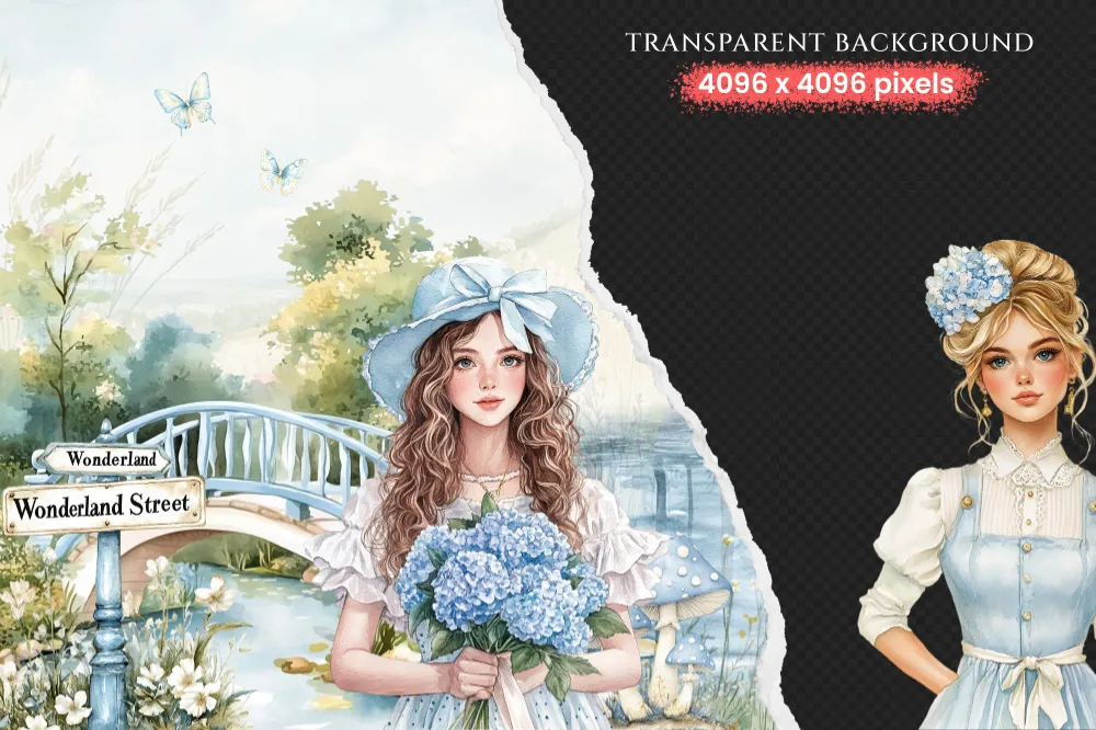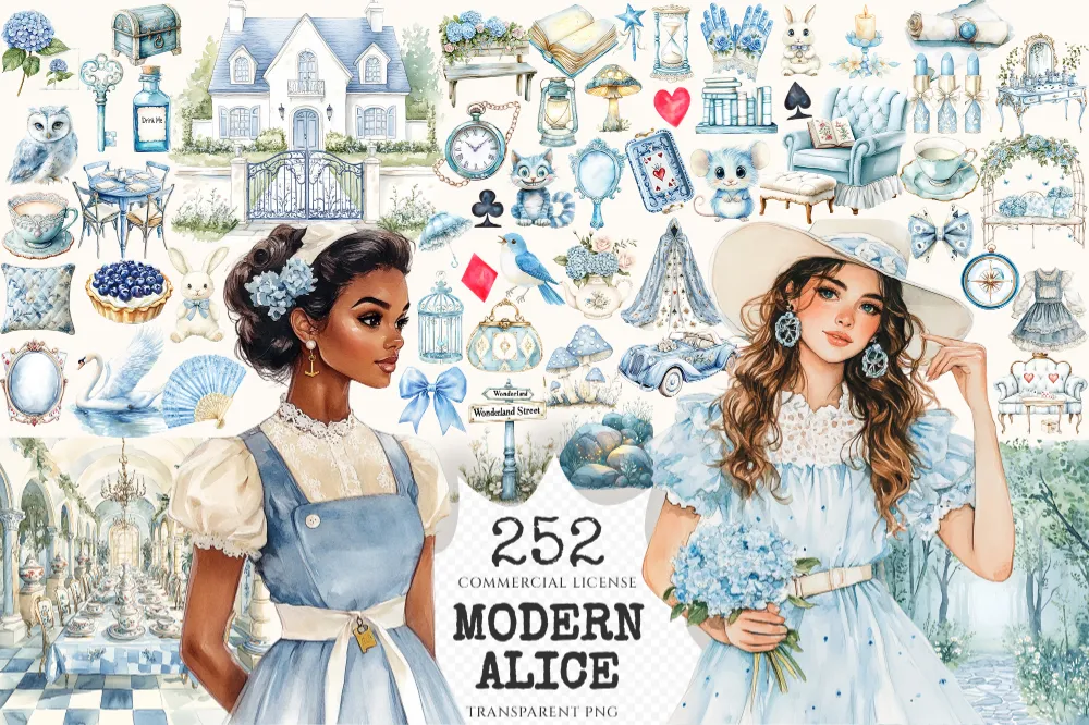 Modern Alice Watercolor Clipart Set – 250+ transparent PNG, Alice in wonderland graphics, Fairytale images, Commercial use, Digital download