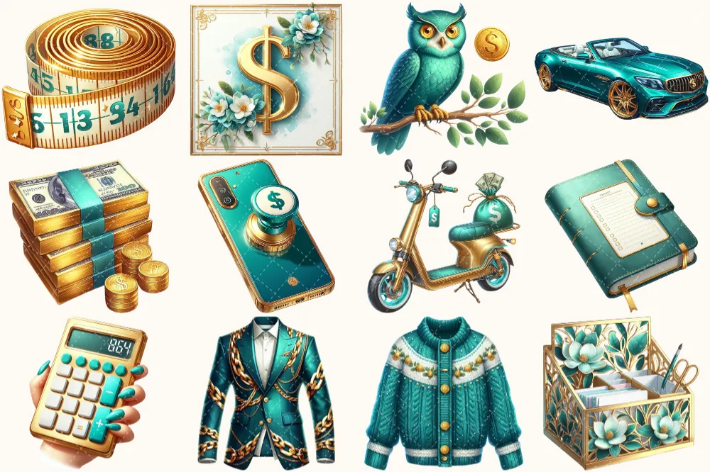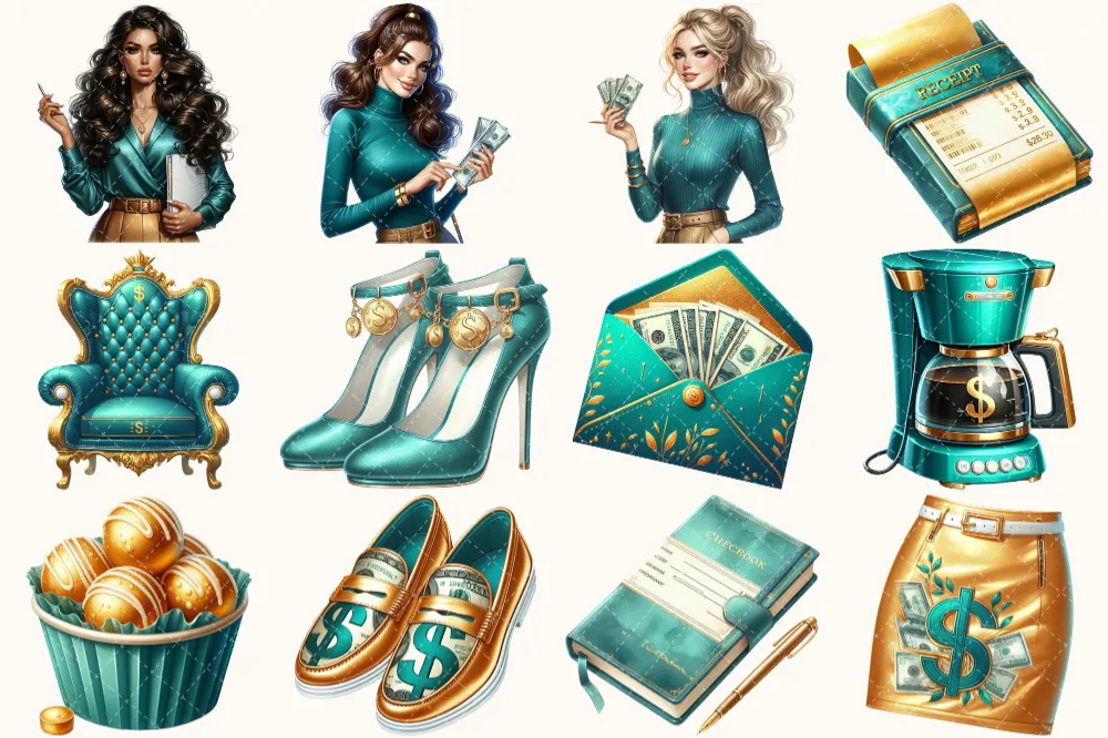 Money Girl Clipart Set – 100+ transparent PNG, Finance planning illustrations, Bank cash printables, Commercial use, Digital download