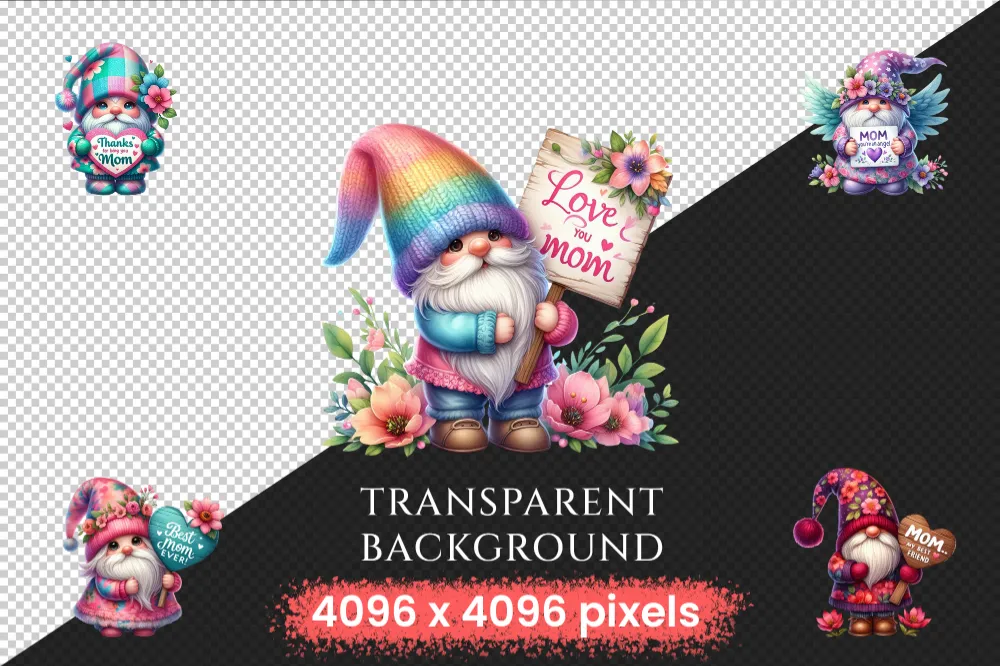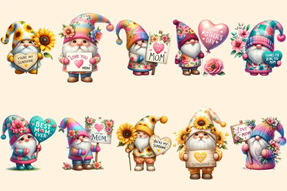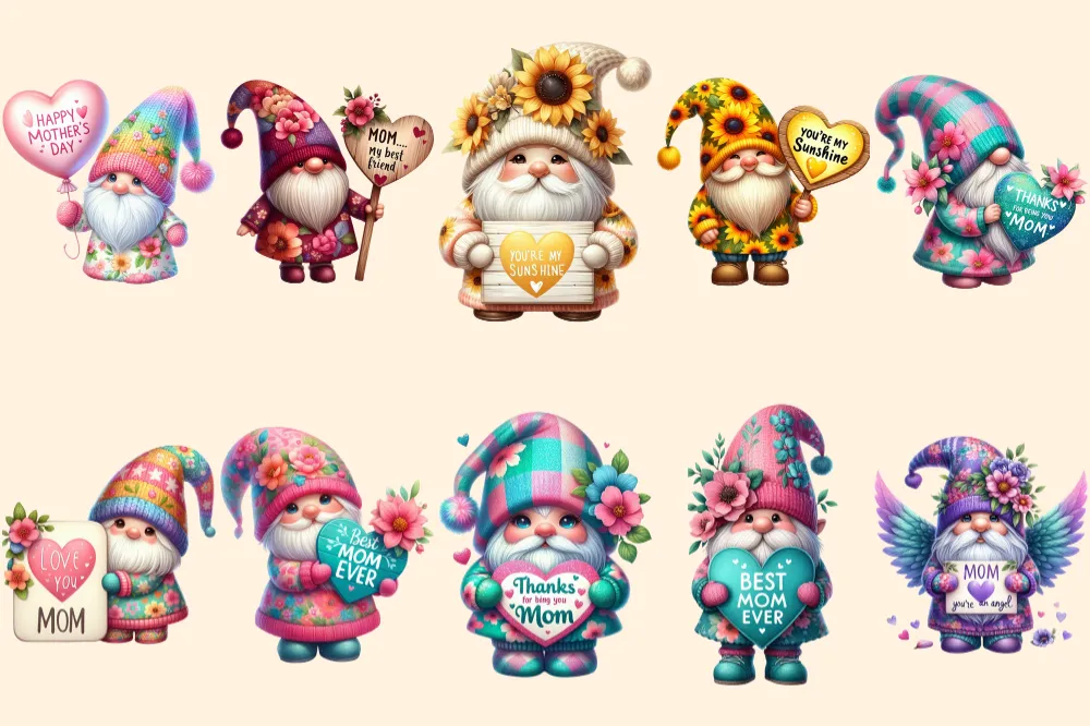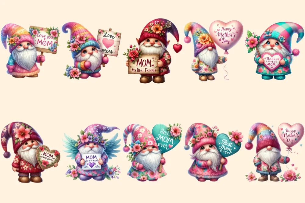 Mother’s Day Gnomes PNG Clipart Collection – 46 PNG, Mom’s love gnome graphics, Adorable gnome prints, Commercial use, Digital download