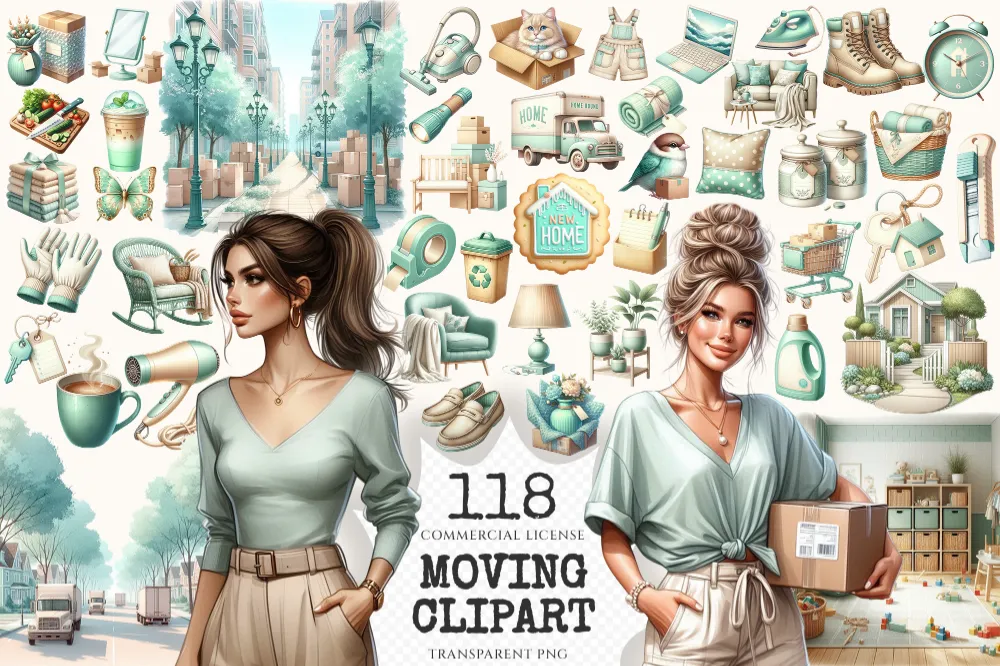 Moving Clipart Set – 110+ transparent PNG, New home illustrations, Interior decor graphics, Moving day art, Commercial use, Digital download
