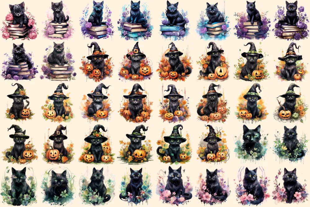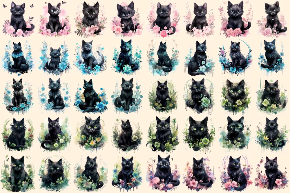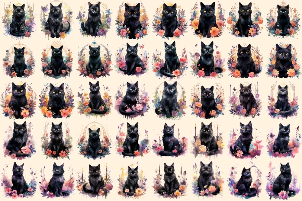 Mystical Cats Watercolor Clipart Bundle – 265+ transparent PNG, Floral fantasy graphics, Enchanting cat png,Commercial use, Digital download