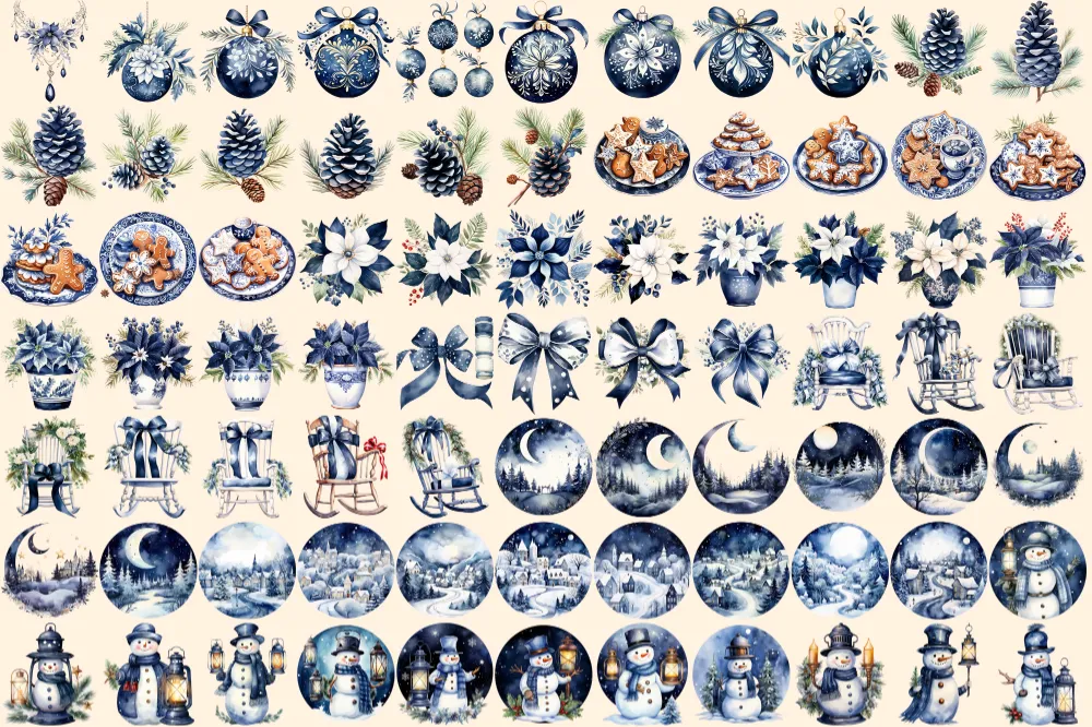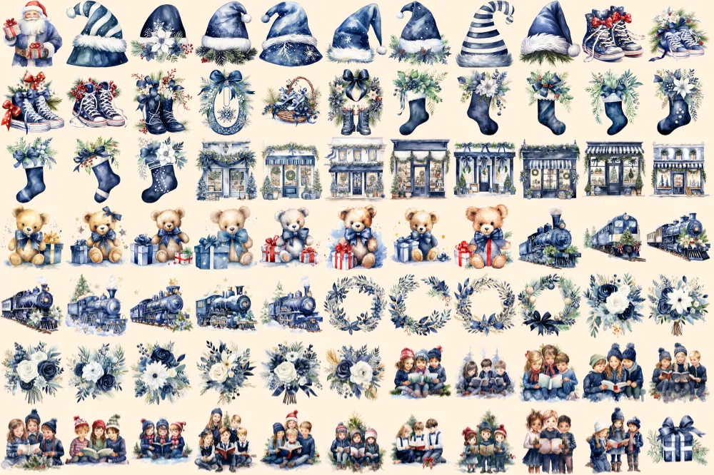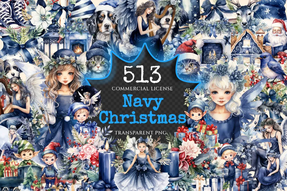 Navy Christmas Watercolor Clipart Bundle – 510+ transparent PNG, Festive decor graphics, Blue holiday png, Commercial use, Digital download