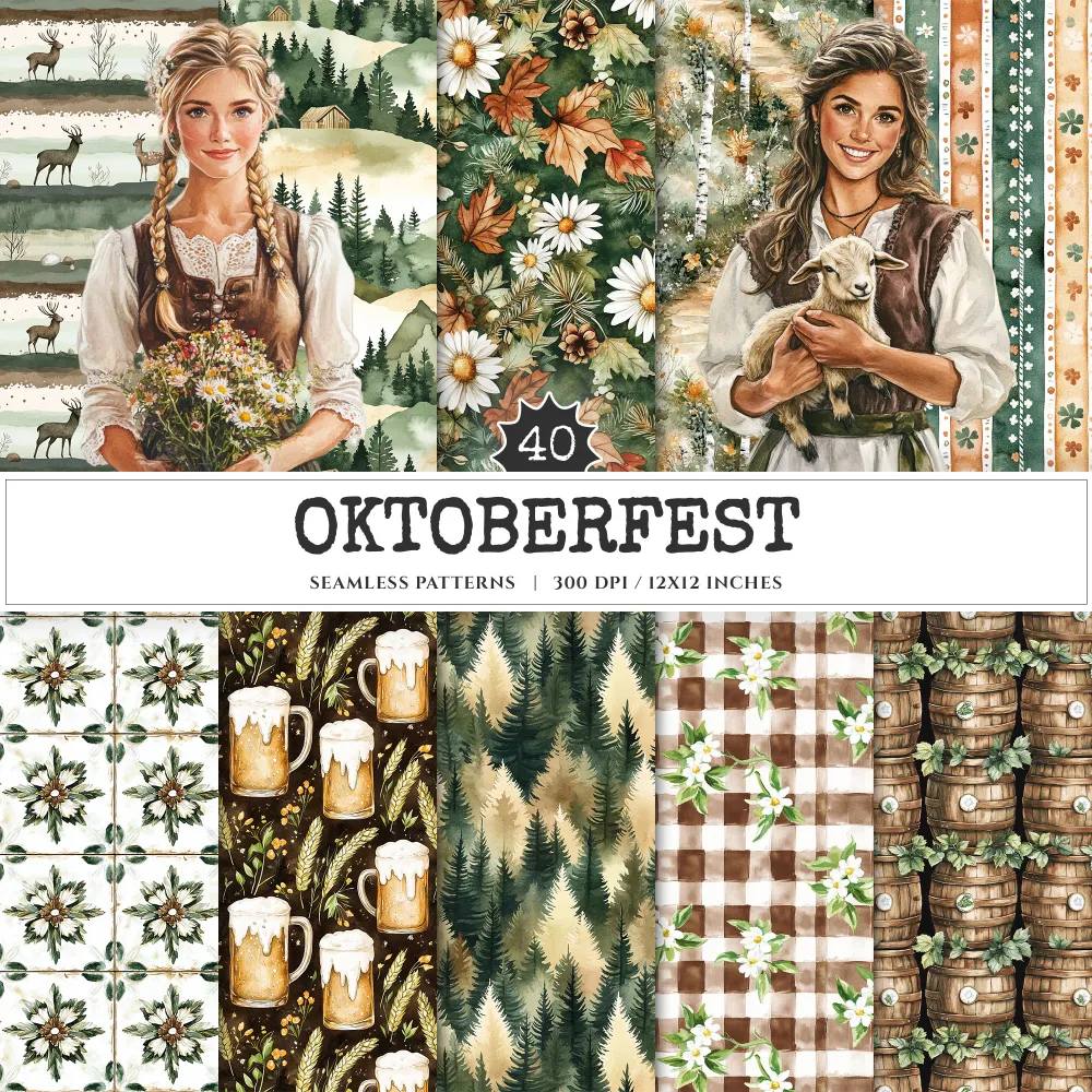 Oktoberfest Seamless Patterns, Cozy autumn JPEG, Bavarian pattern, Leaves, Pumpkin, Alpine tree repeating pattern, Digital scrapbook paper