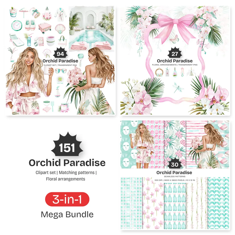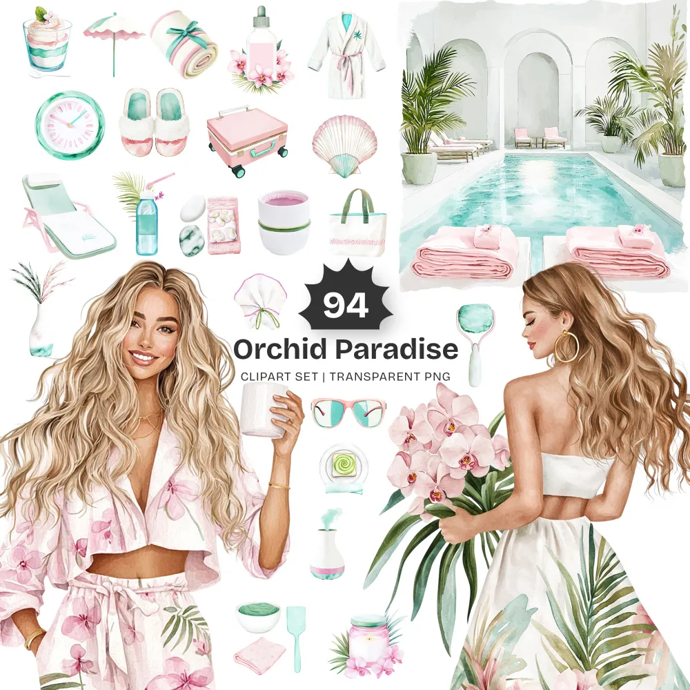 Orchid Paradise Mega Bundle – Tropical Vacation PNG Illustrations, Summer Resort Graphics, Poolside Drinks, Spa Wellness, Digital Download