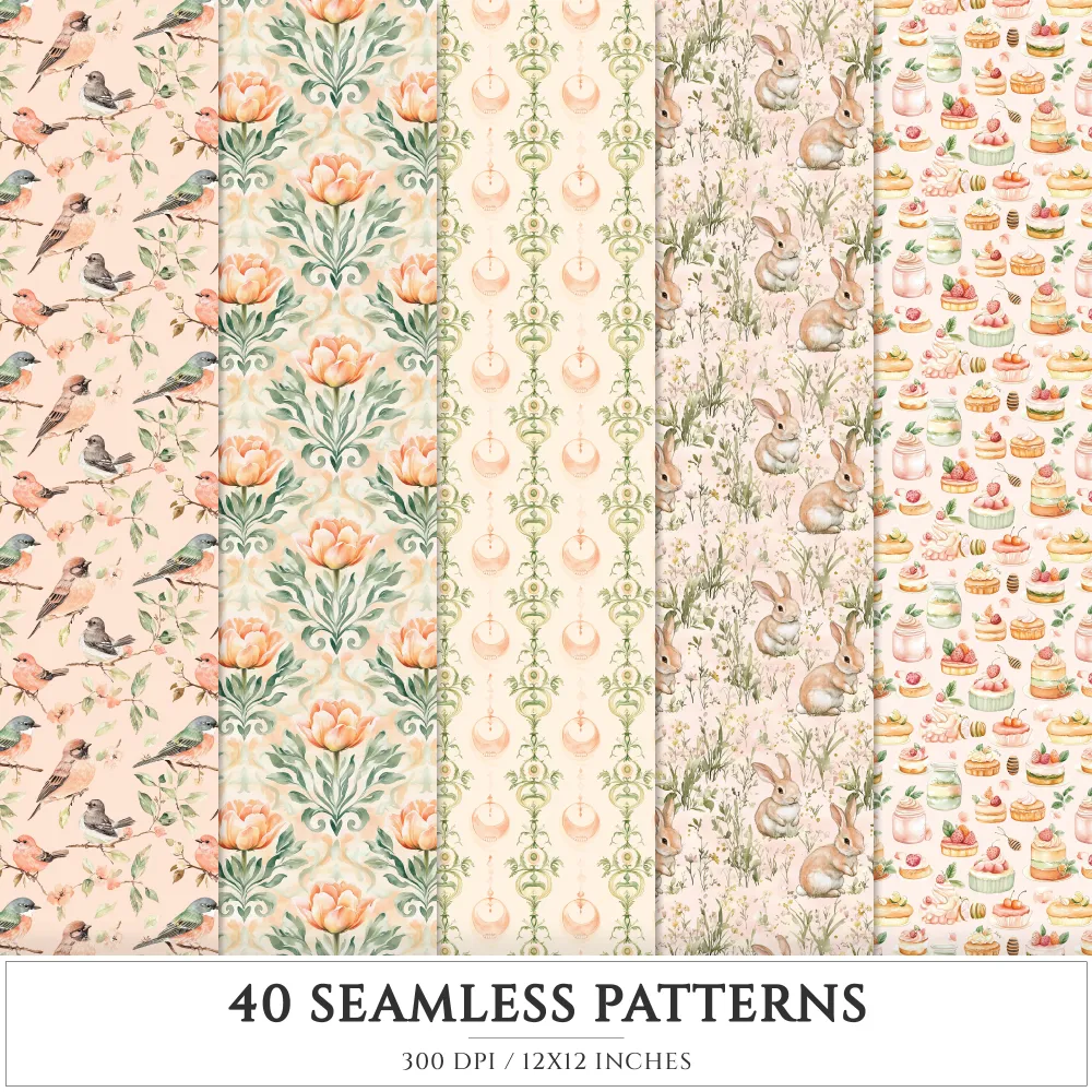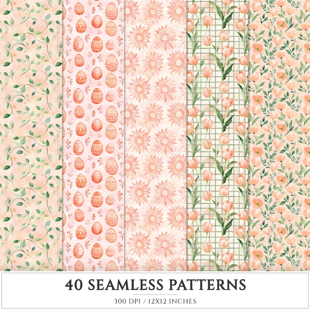 Ostara Spirit Seamless Patterns, Pagan Equinox JPEG, Tulips Pattern, Egg, Rabbit, Florals, Herbs Repeating Pattern, Digital Scrapbook Paper