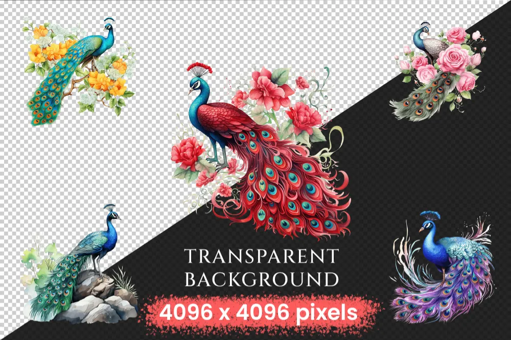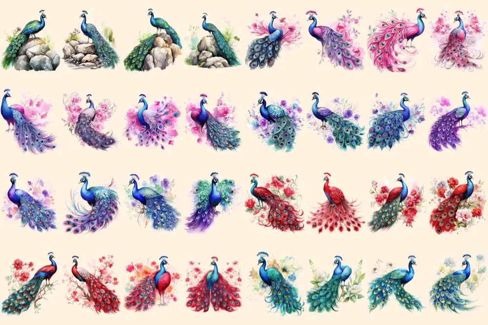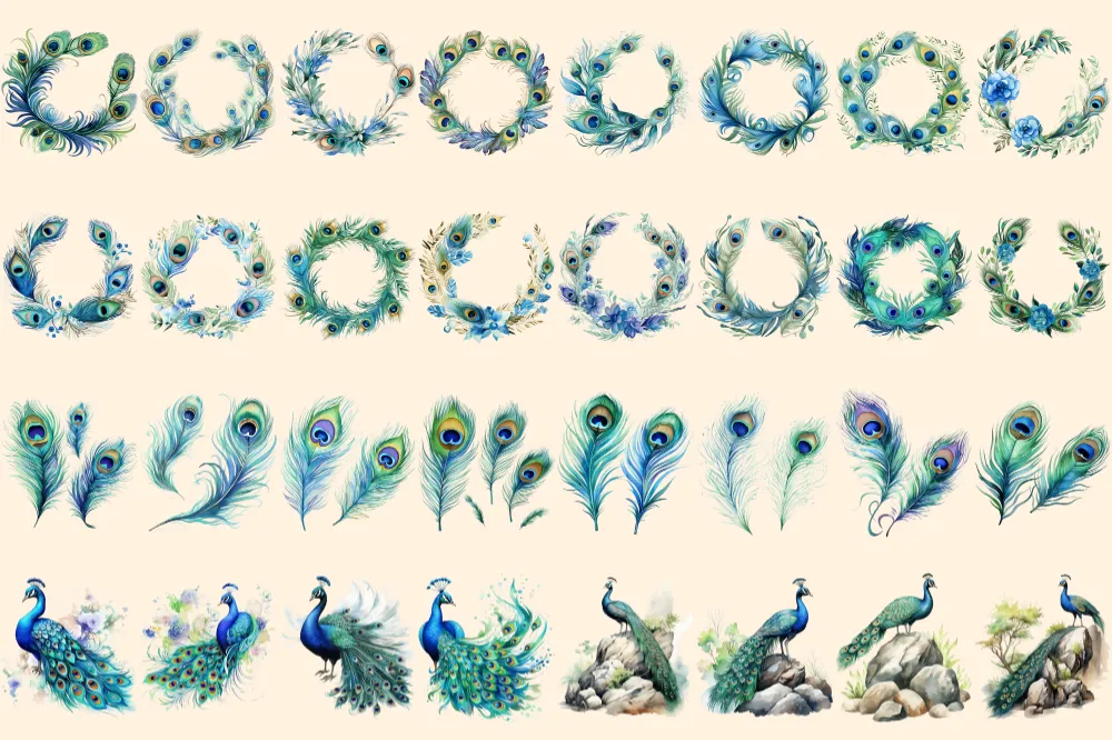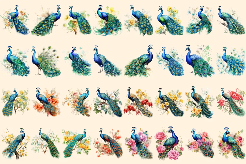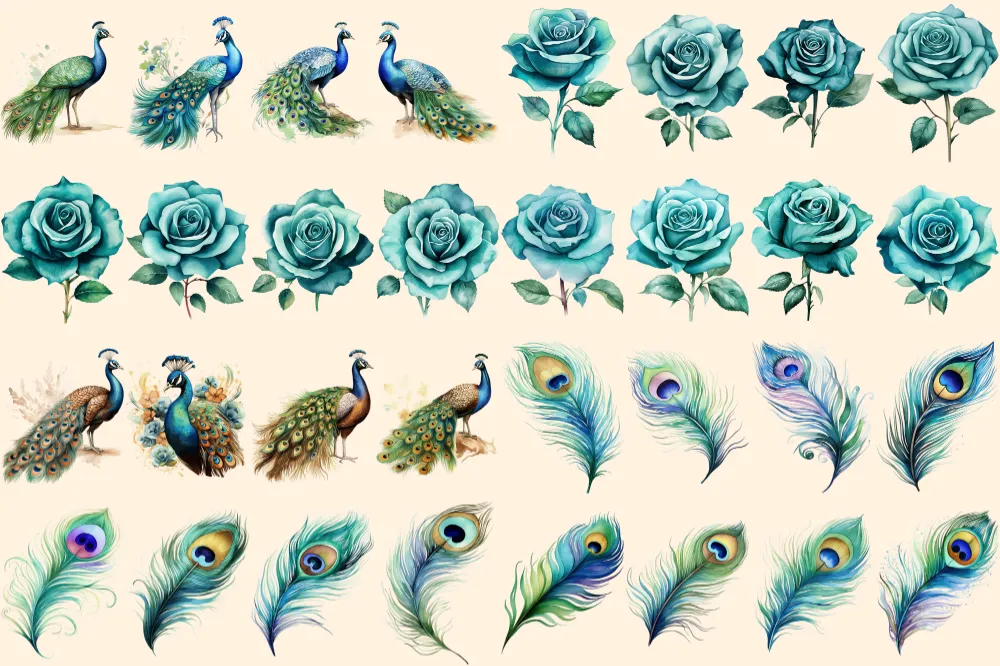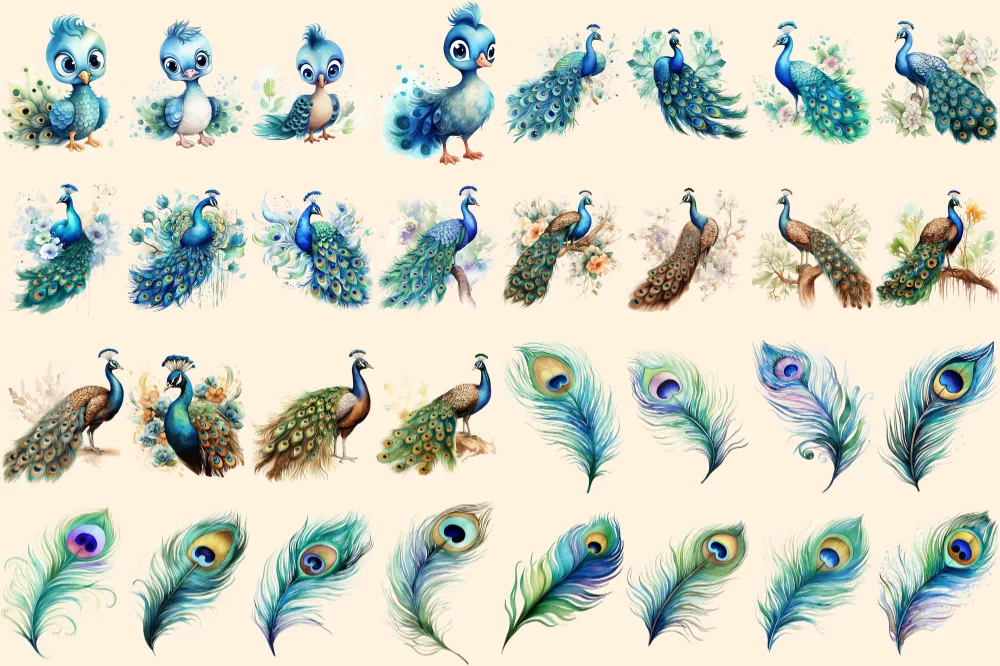 Peacocks Watercolor Clipart Bundle – 205+ transparent PNG, Regal bird illustrations, Colorful peacocks png, Commercial use, Digital download