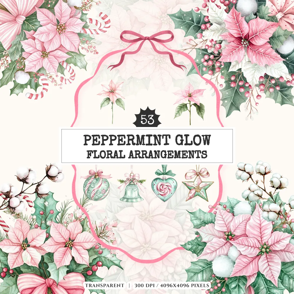 Peppermint Glow Floral Arrangements, Poinsettia floral png, Christmas bouquet, Ornaments, Christmas decor, Commercial use, Digital download