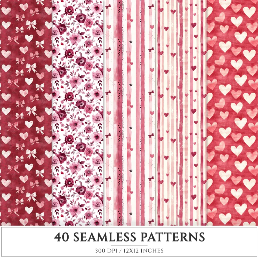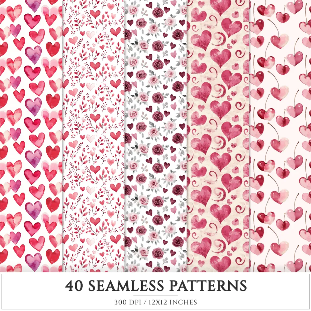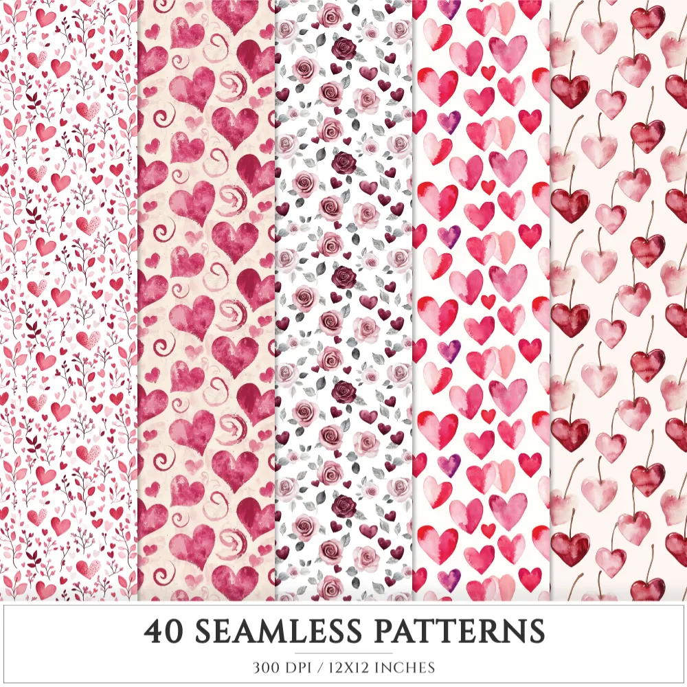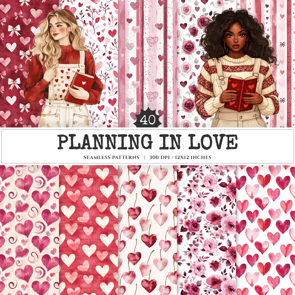 Planning in Love Seamless Patterns, Shabby chic roses JPEG, Heart infinite pattern, Valentine repeating pattern, Digital scrapbook paper