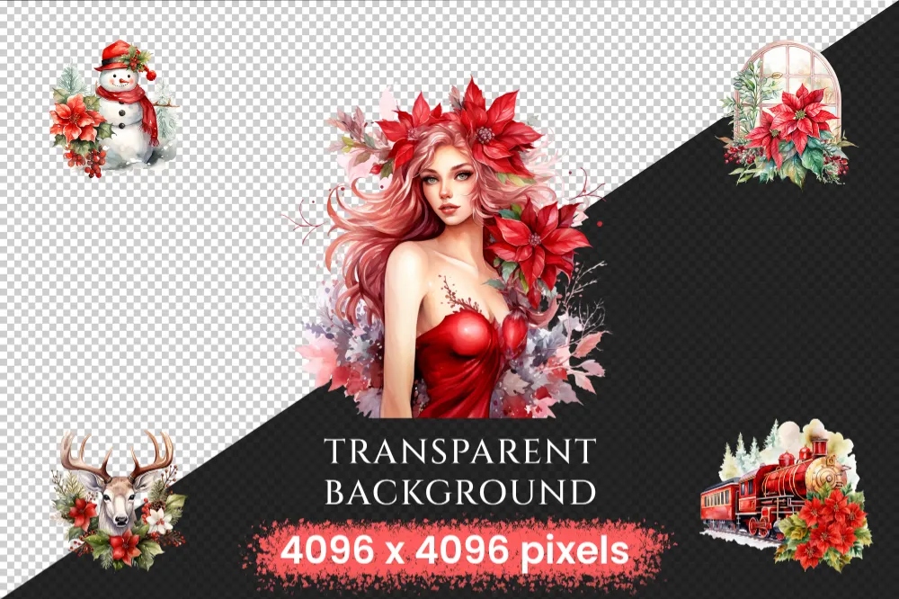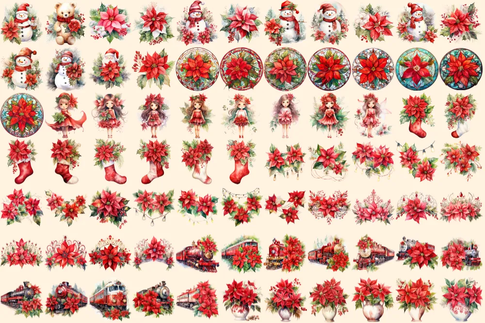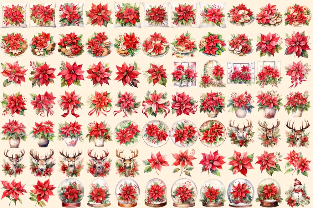 Poinsettias Watercolor Clipart Bundle – 515+ transparent PNG, Festive floral graphics, Poinsettia images, Commercial use, Digital download