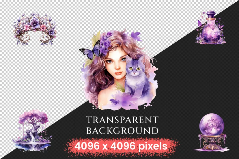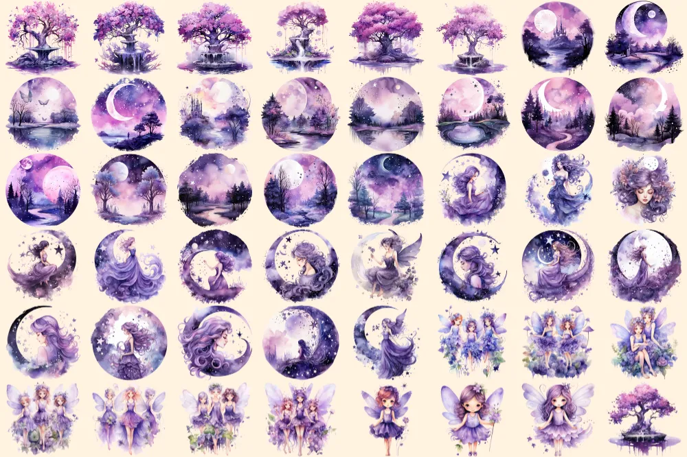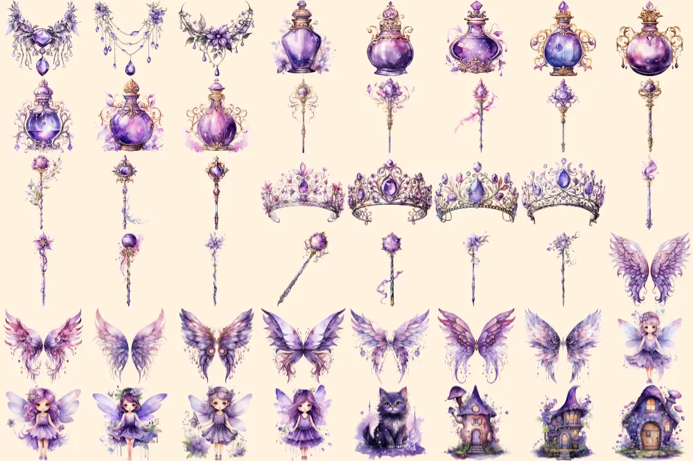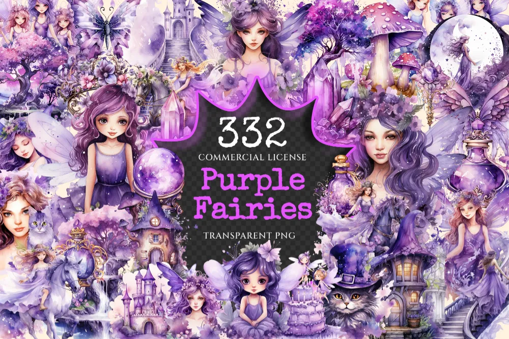 Purple Fairies Watercolor Clipart Bundle – 330+ transparent PNG, Whimsical fairy png, Storybook magic art, Commercial use, Digital download