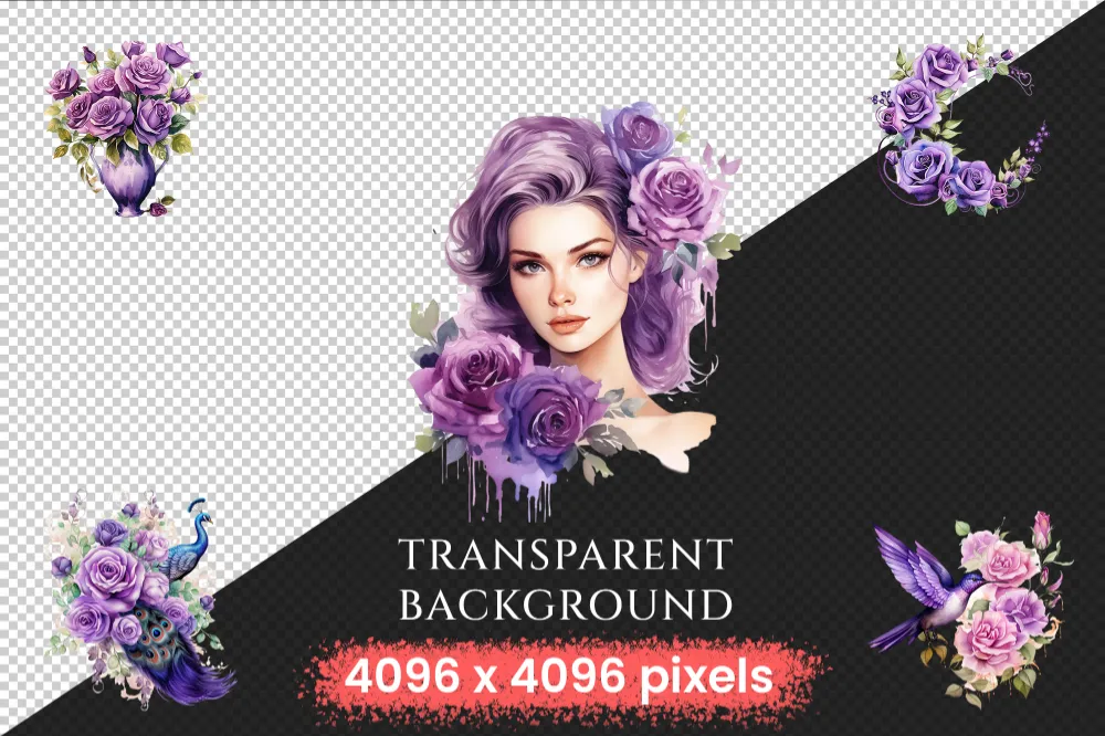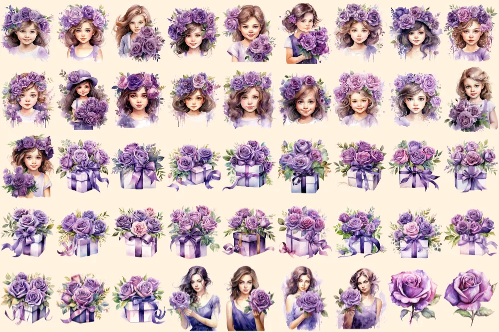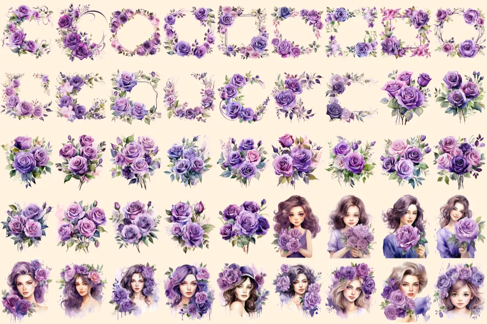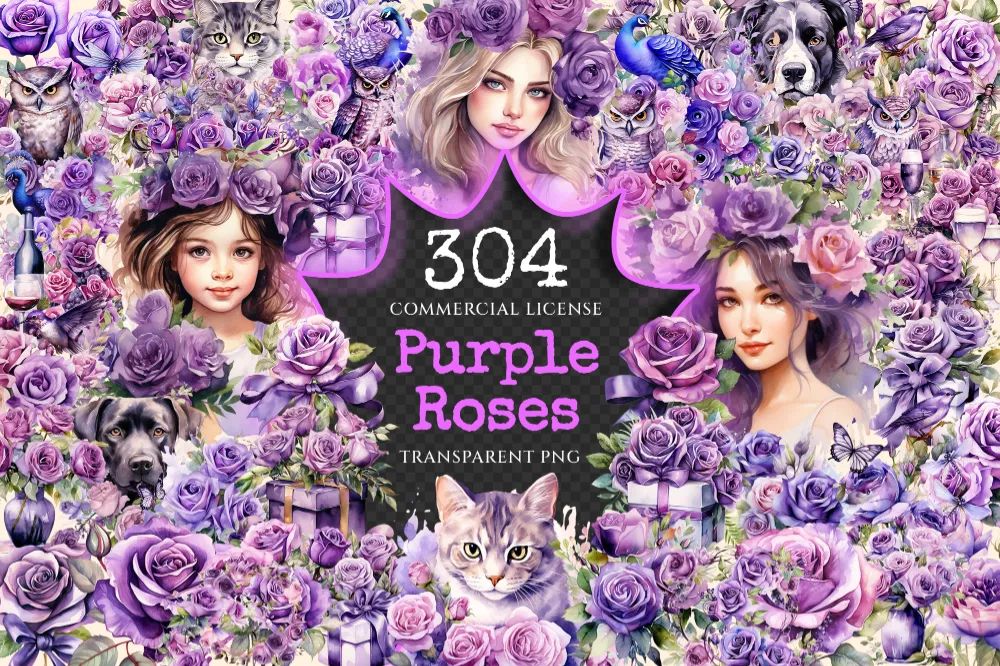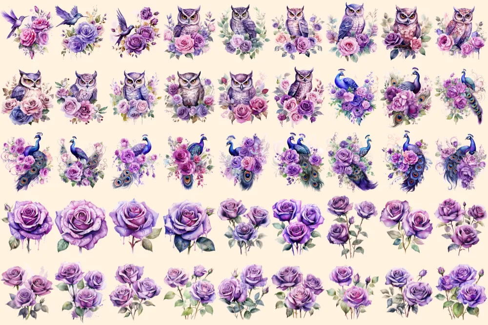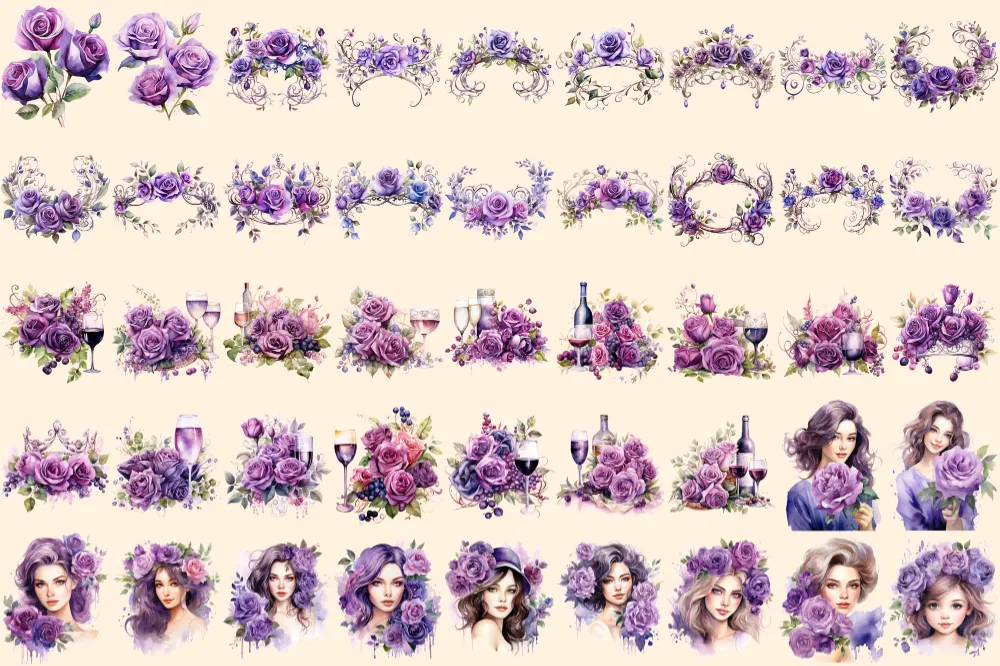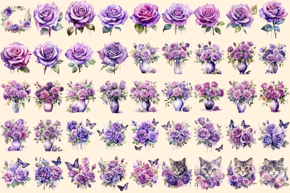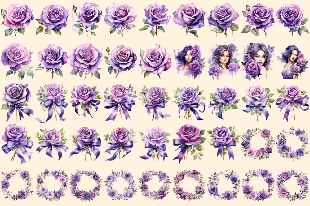 Purple Roses Watercolor Clipart Bundle – 300+ transparent PNG, Stunning flower graphics, Rose leaf images, Commercial use, Digital download