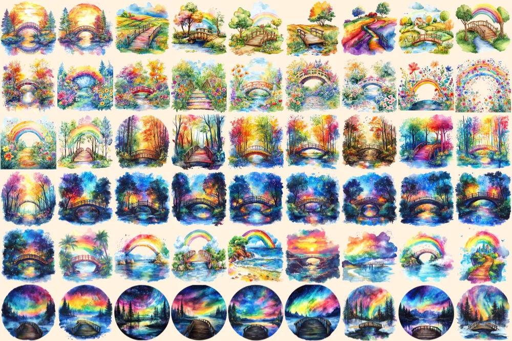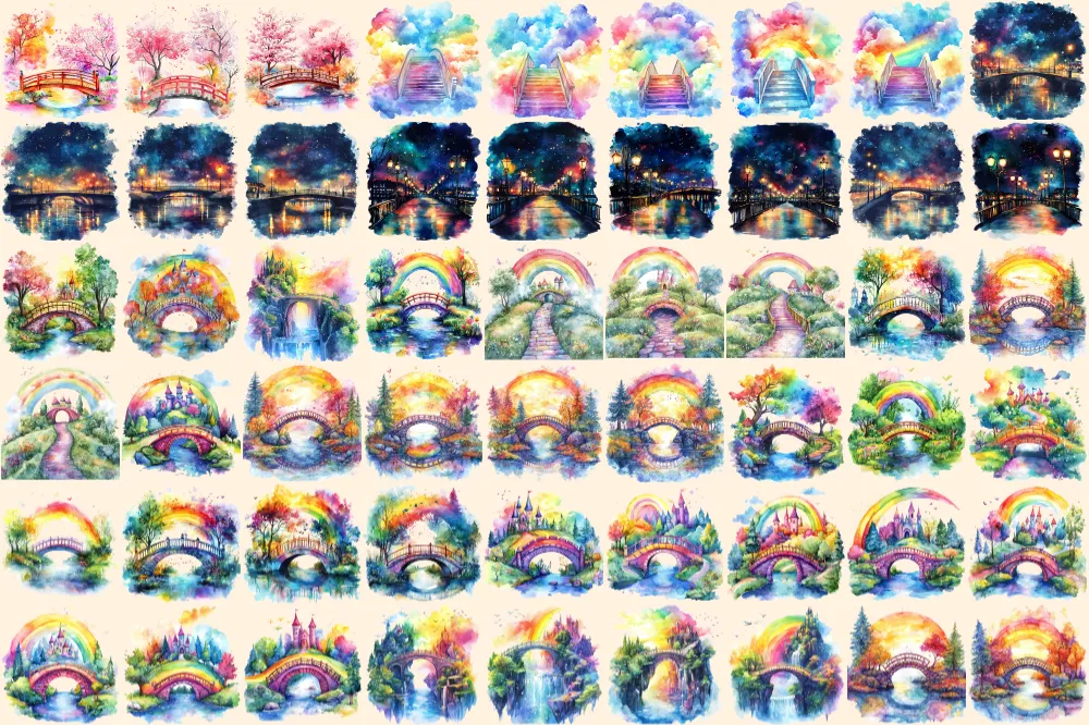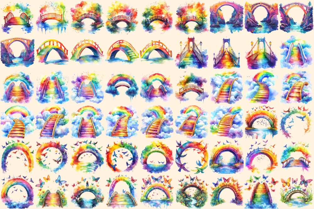 Rainbow Bridges Watercolor Clipart Bundle – 352+ transparent PNG, Colorful archway images, Vibrant bridge, Commercial use, Digital download