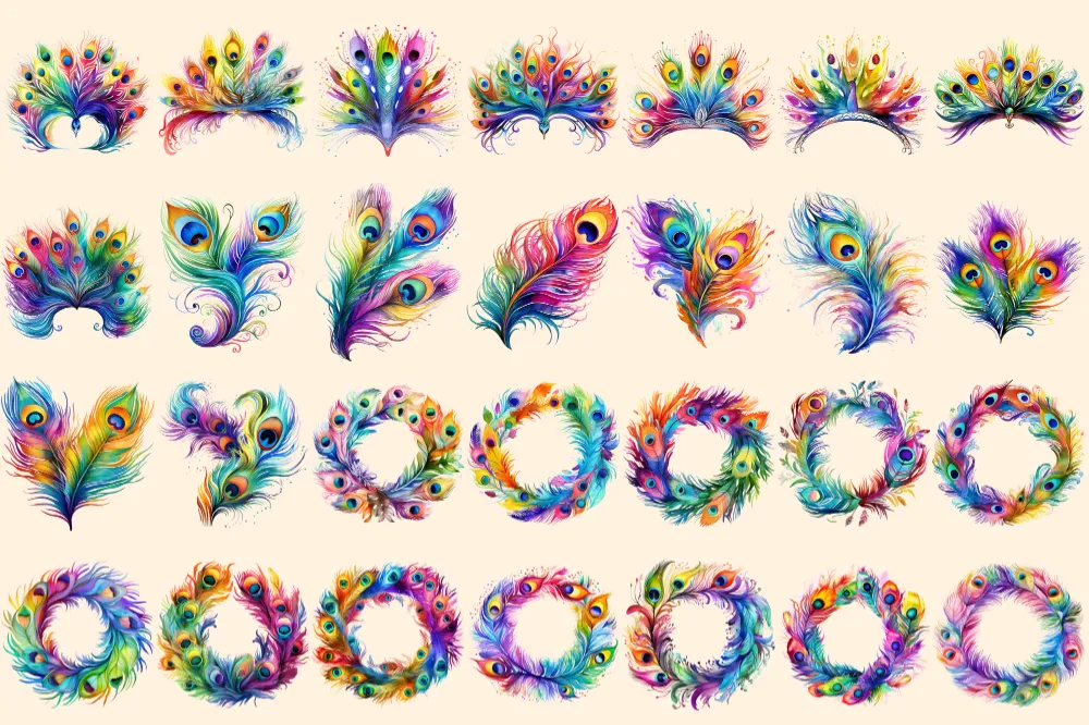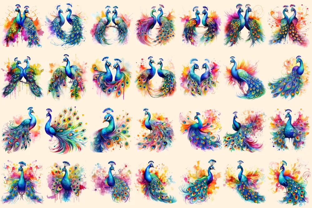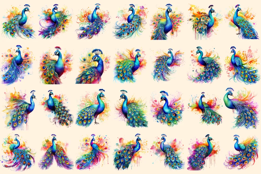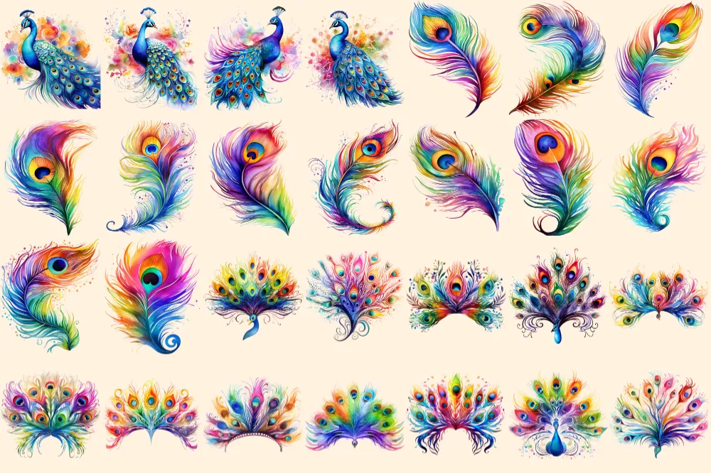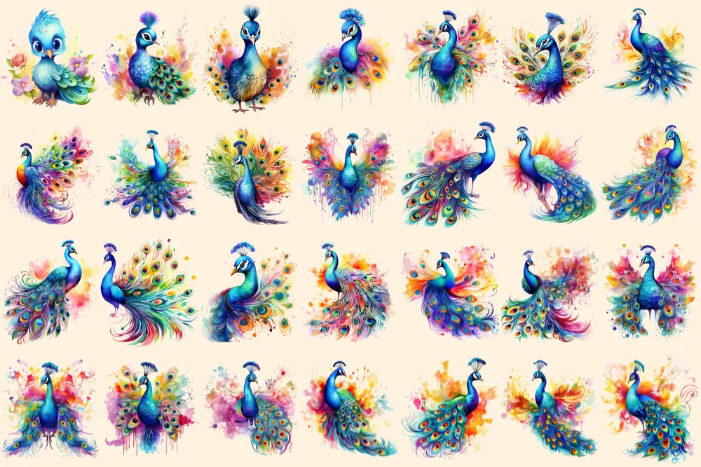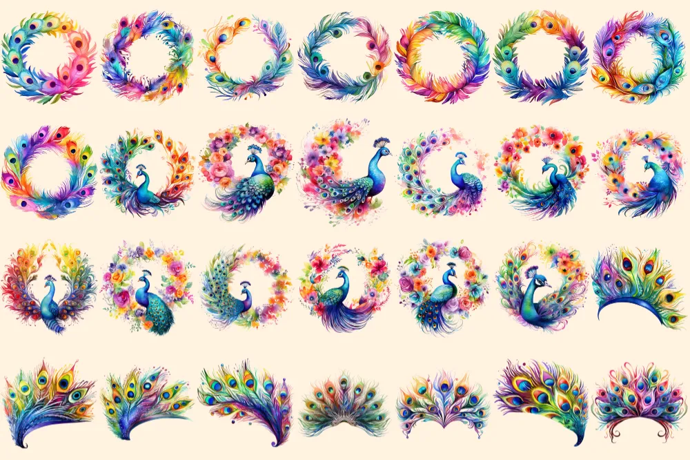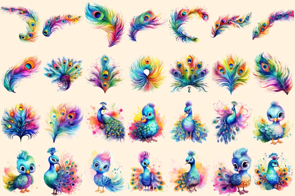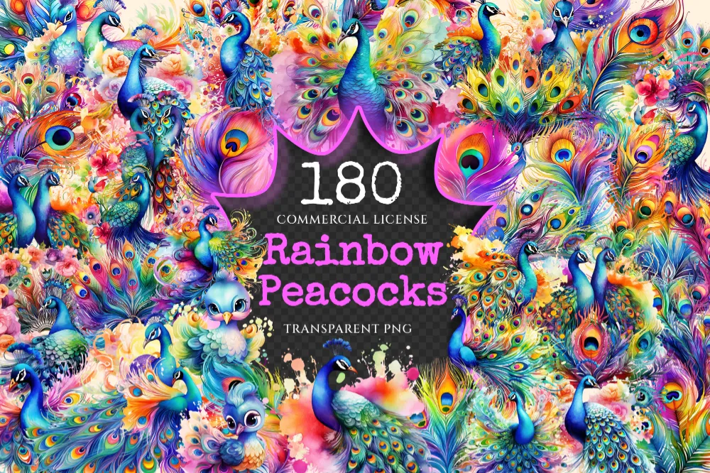 Rainbow Peacocks Watercolor Clipart Bundle – 175+ transparent PNG, Vibrant bird png, Colorful feathered art, Commercial use,Digital download