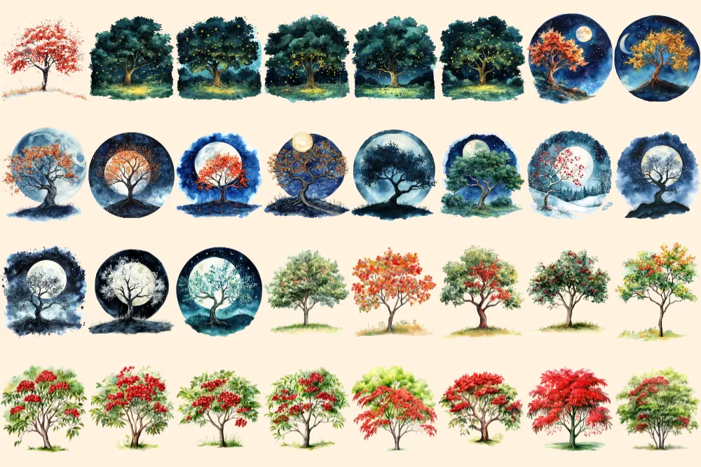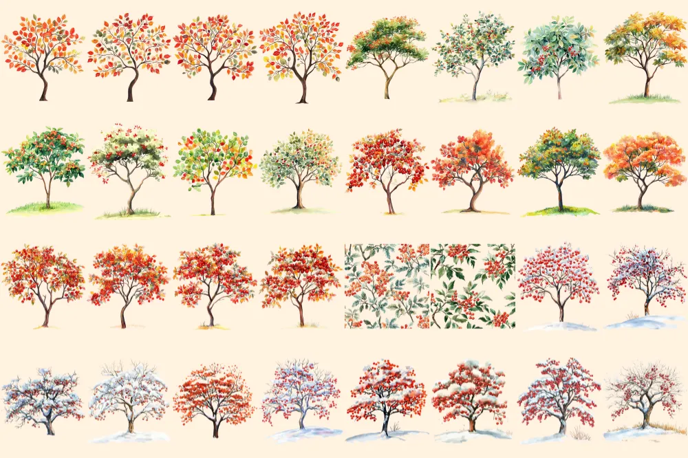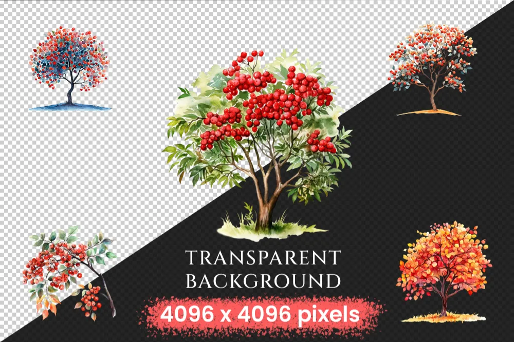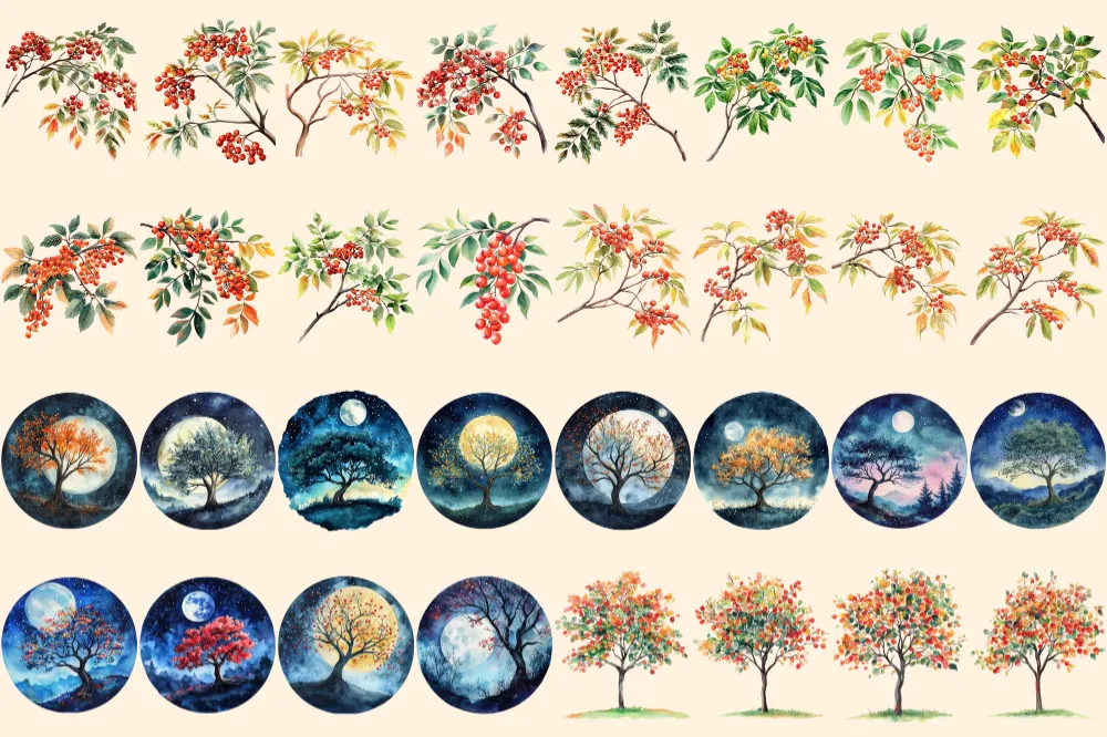 Rowan Trees Watercolor Clipart Bundle – 208+ transparent PNG, Mystical tree illustrations, Enchanted decor, Commercial use, Digital download