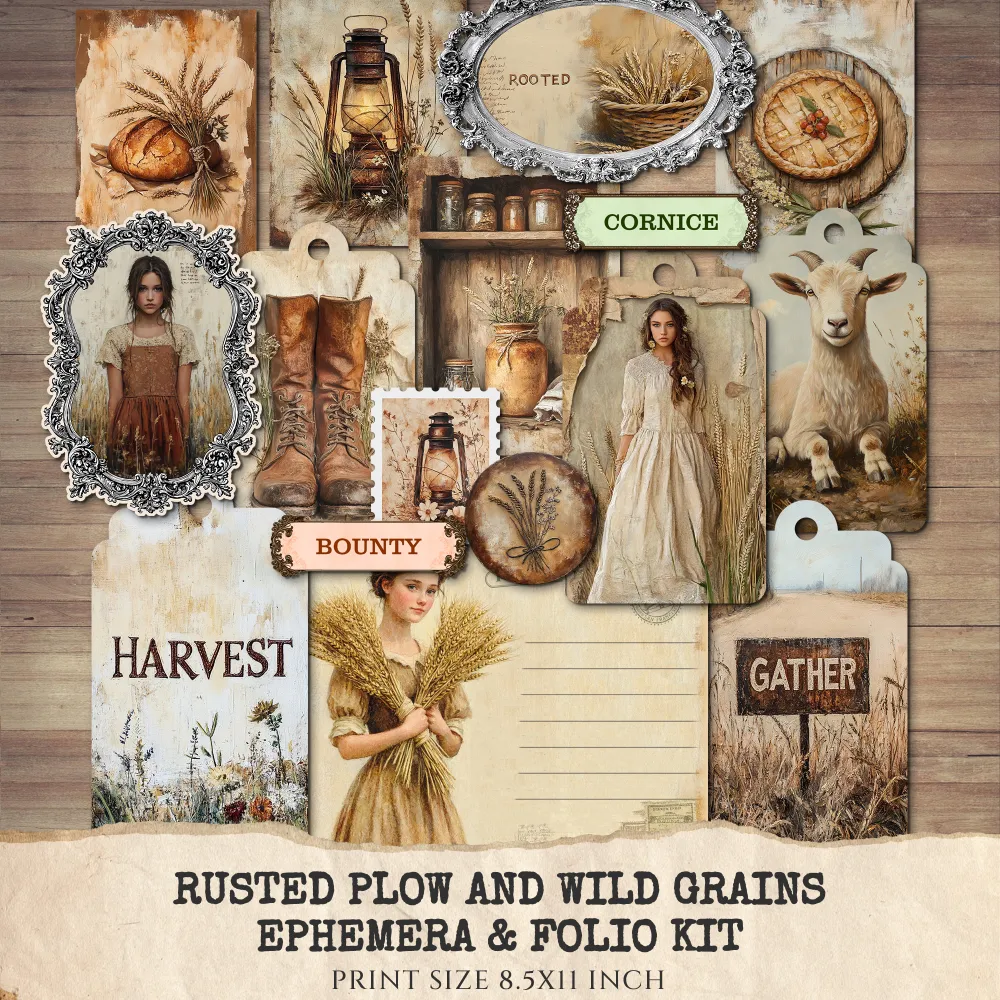 Rusted Plow and Wild Grains Ephemera & Folio Kit – Rustic Farm Harvest, Neutral Farmhouse Printables, Vintage Tags, Kits, Digital Download
