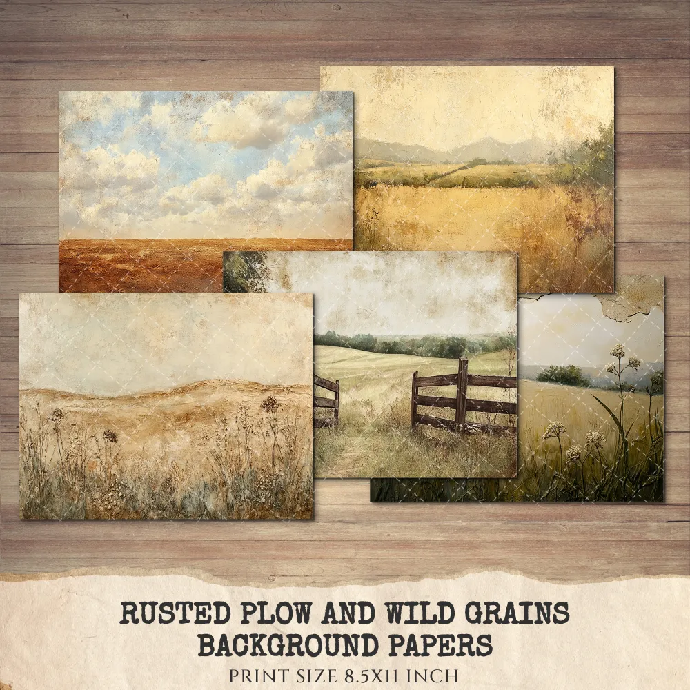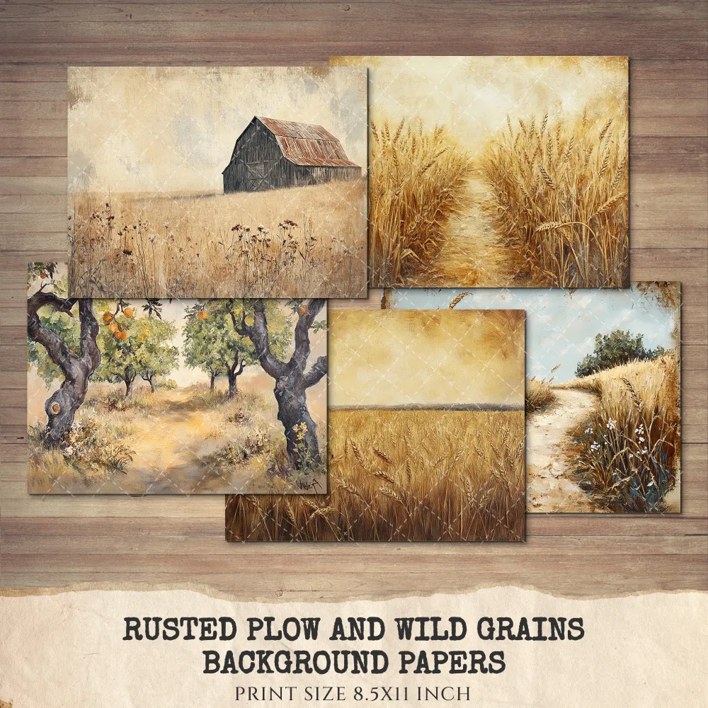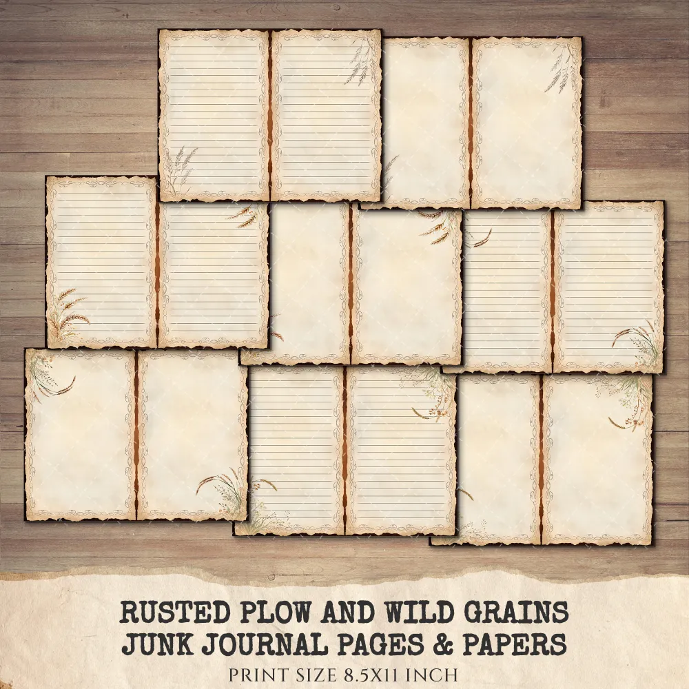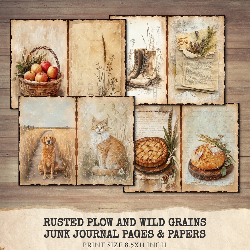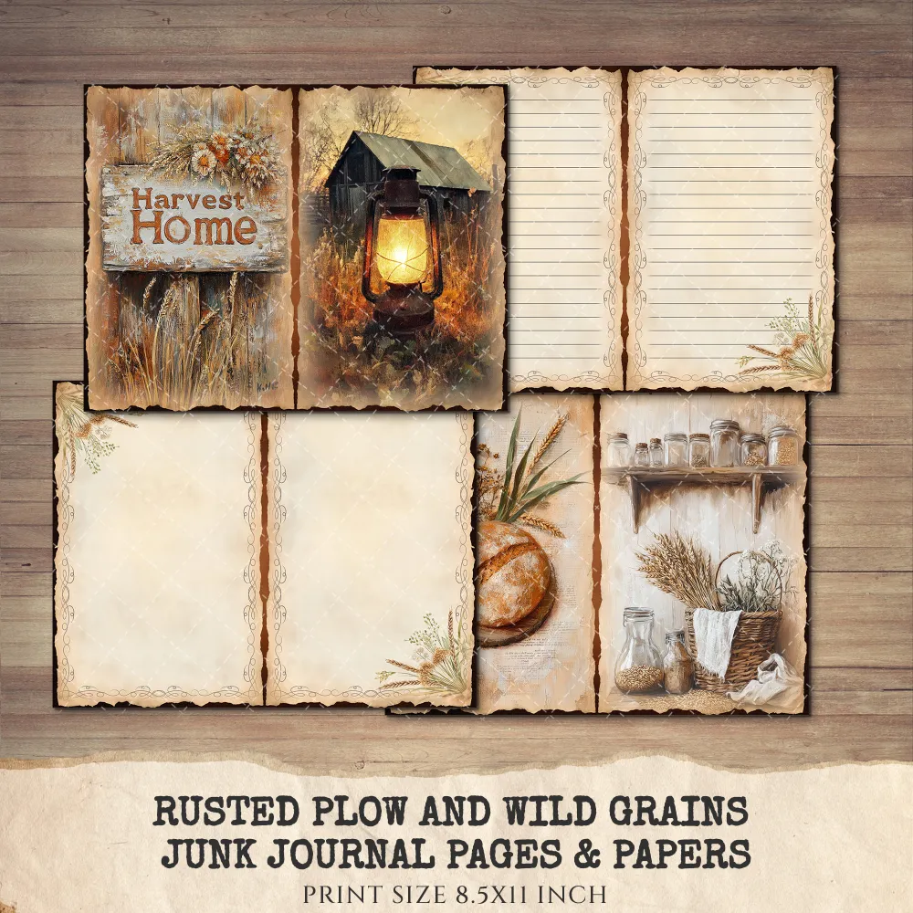 Rusted Plow and Wild Grains Junk Journal Pages & Papers – Rustic Farm Harvest, Neutral Farmhouse Printable, Scrapbook, Digital Download