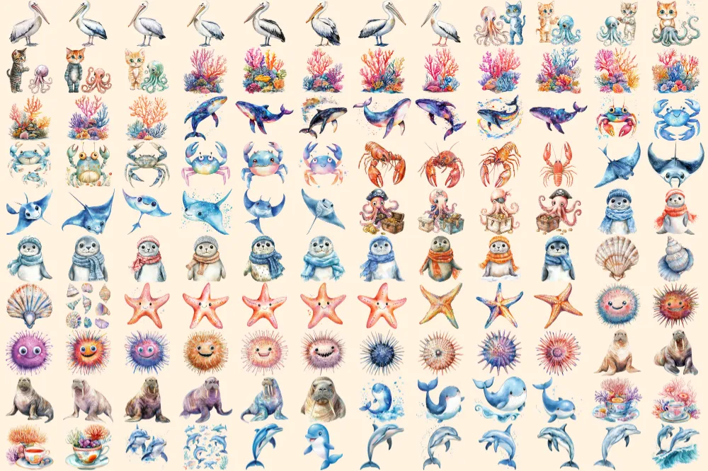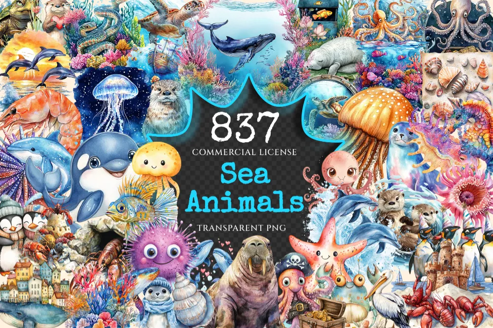 Sea Animals Watercolor Clipart Bundle – 832+ transparent PNG, Marine wildlife graphics, Ocean creature art, Commercial use, Digital download