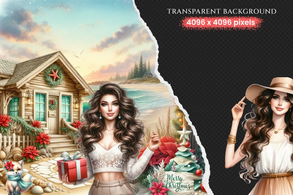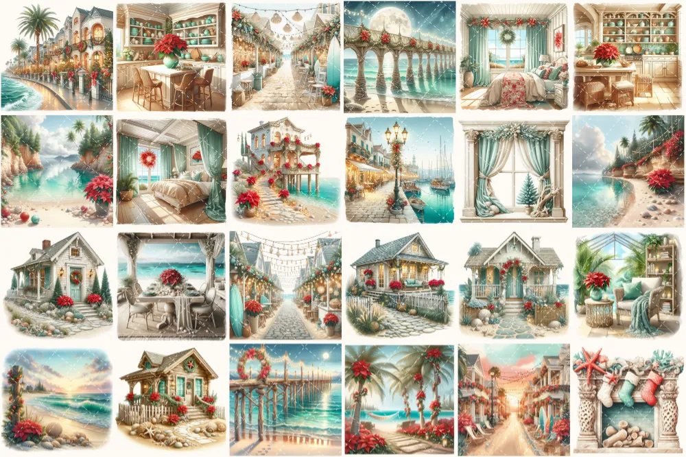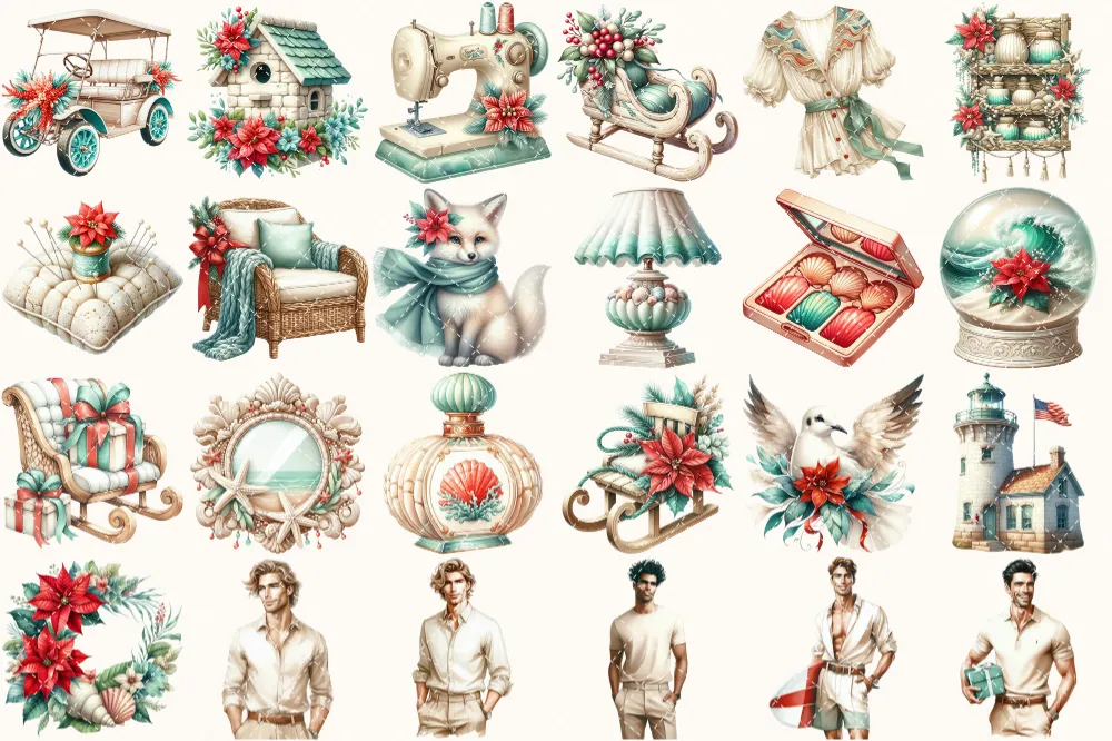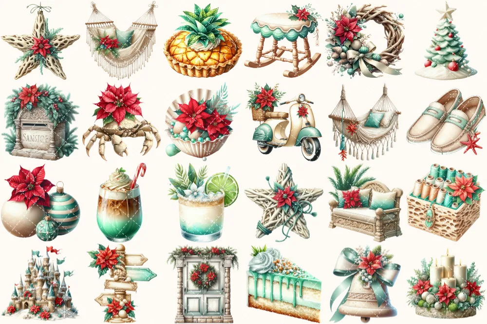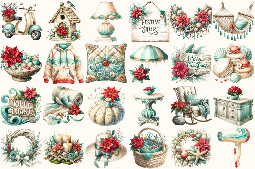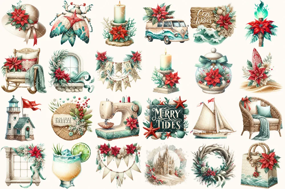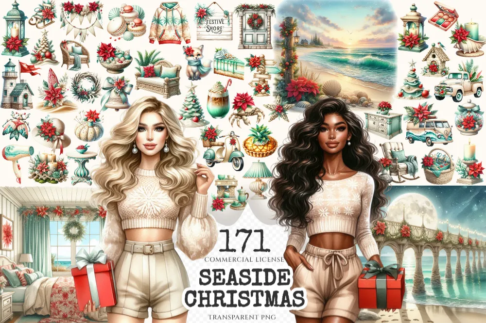 Seaside Christmas Watercolor Clipart Set – 170+ transparent PNG, Festive Beach Illustrations, Xmas, Cozy Holiday Art, Digital Download