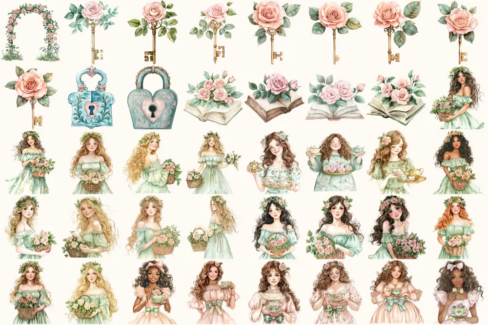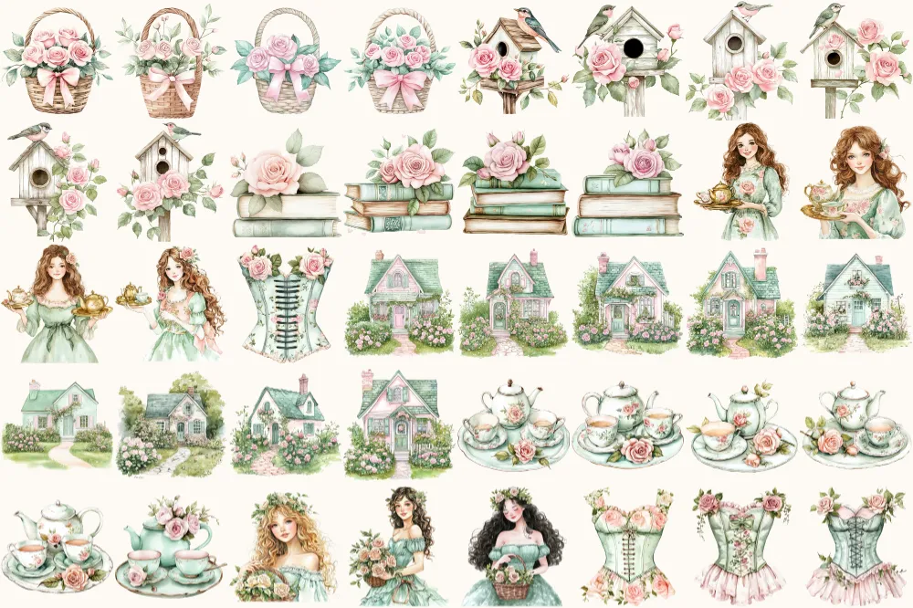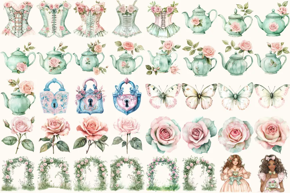 Secret Garden Watercolor Clipart Set – 275+ transparent PNG, Garden tea party graphics, Spring greenery art, Commercial use,Digital download