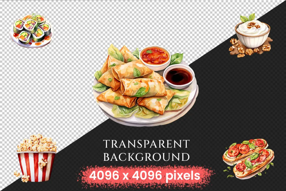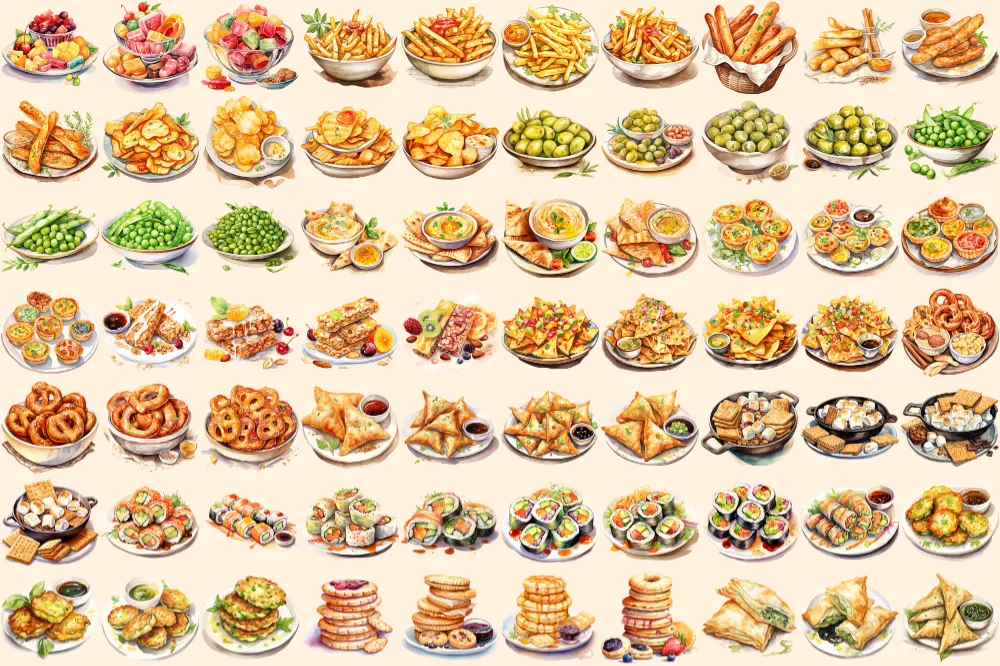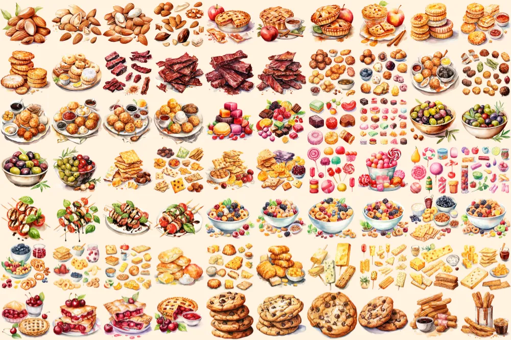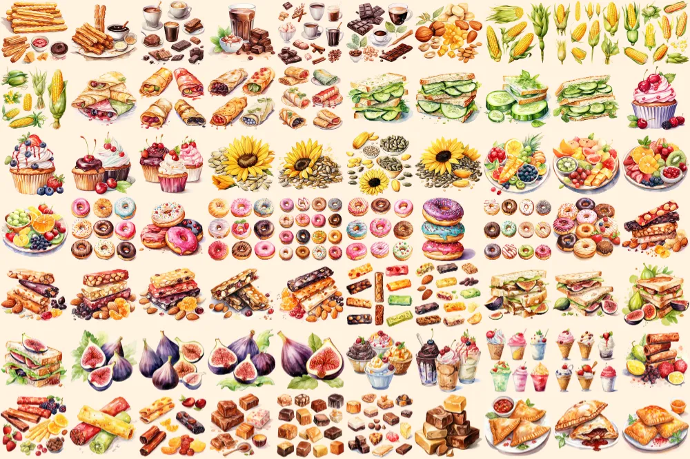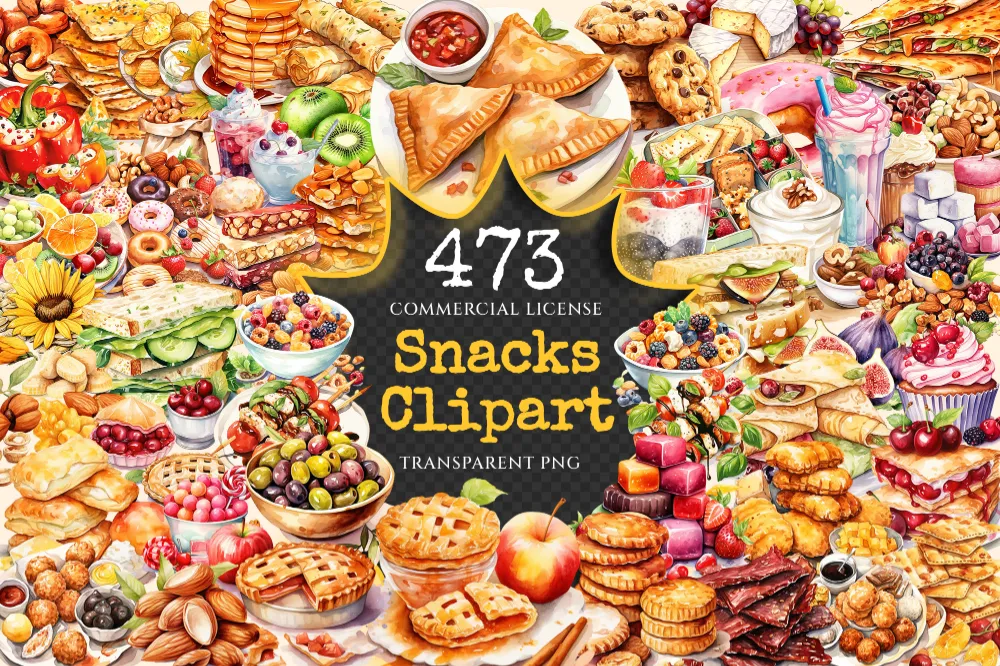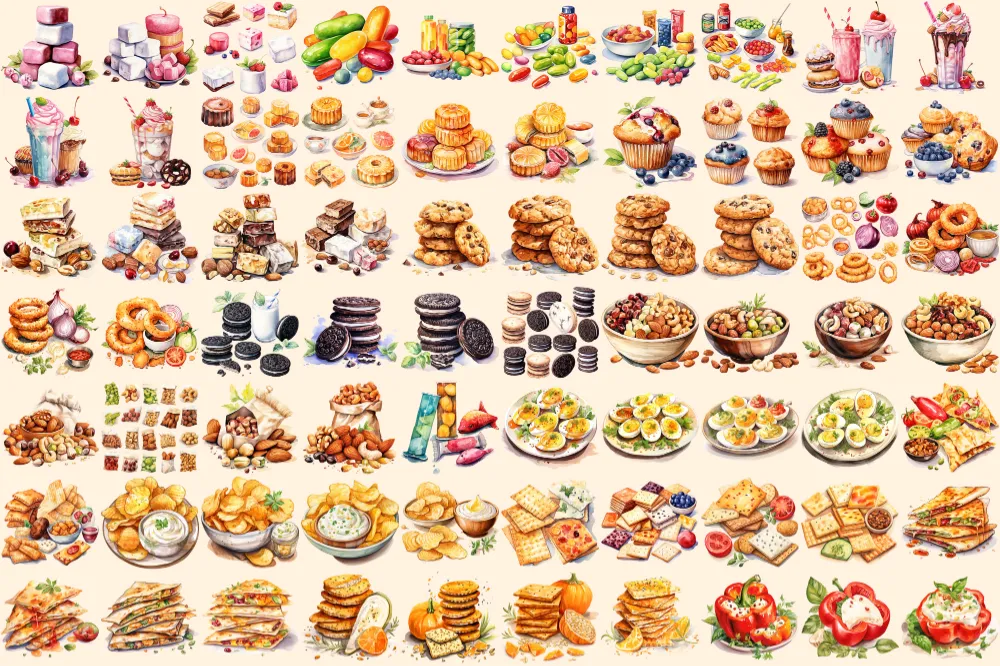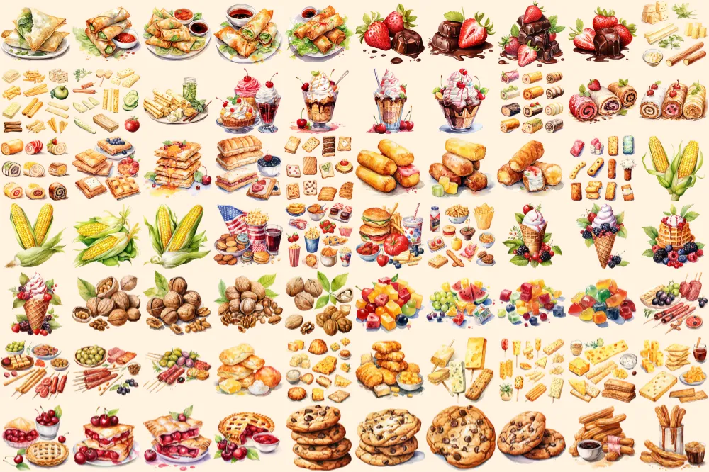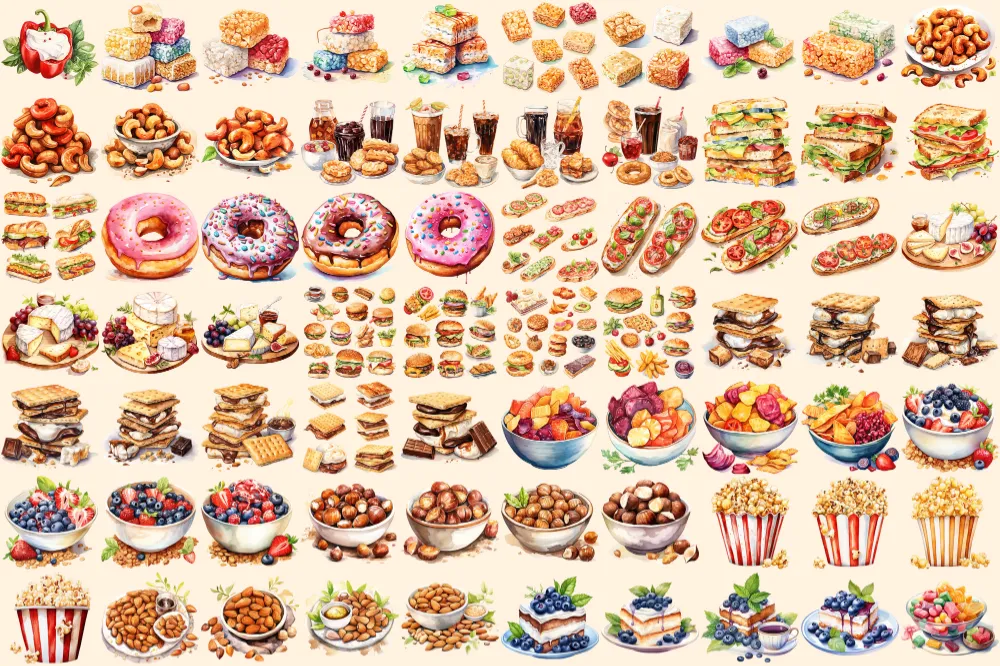 Snacks Watercolor Clipart Bundle – 470+ transparent PNG, Delicious snack variety graphics, Fast food png, Commercial use, Digital download