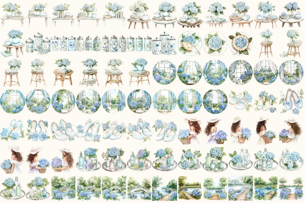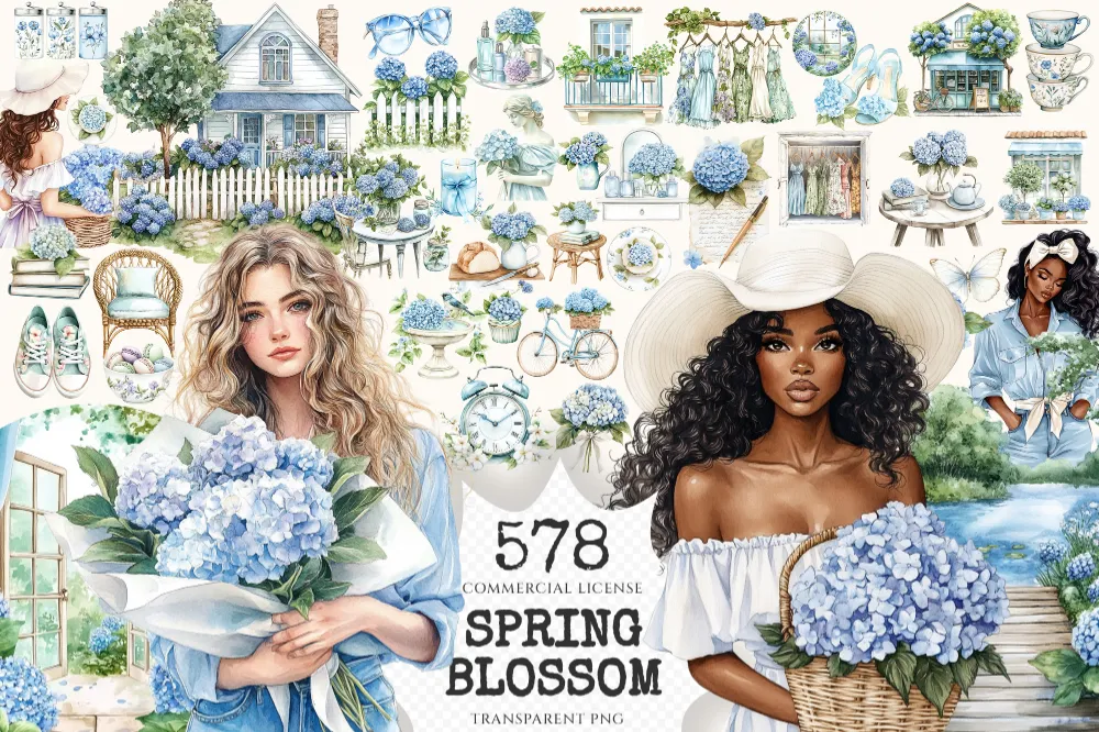 Spring Blossom Watercolor Clipart Set – 575+ transparent PNG, Spring floral illustrations, Hydrangea png, Commercial use, Digital download