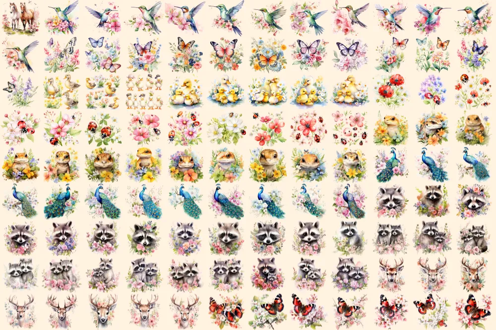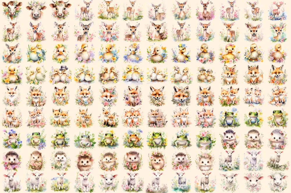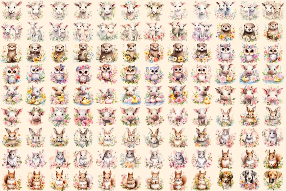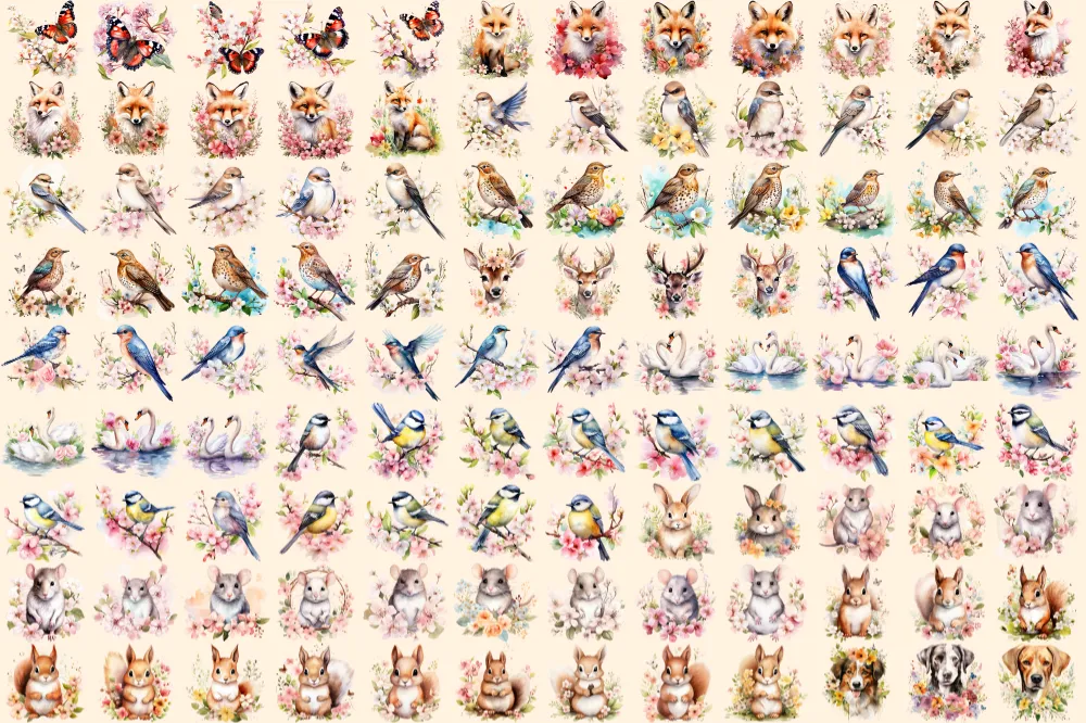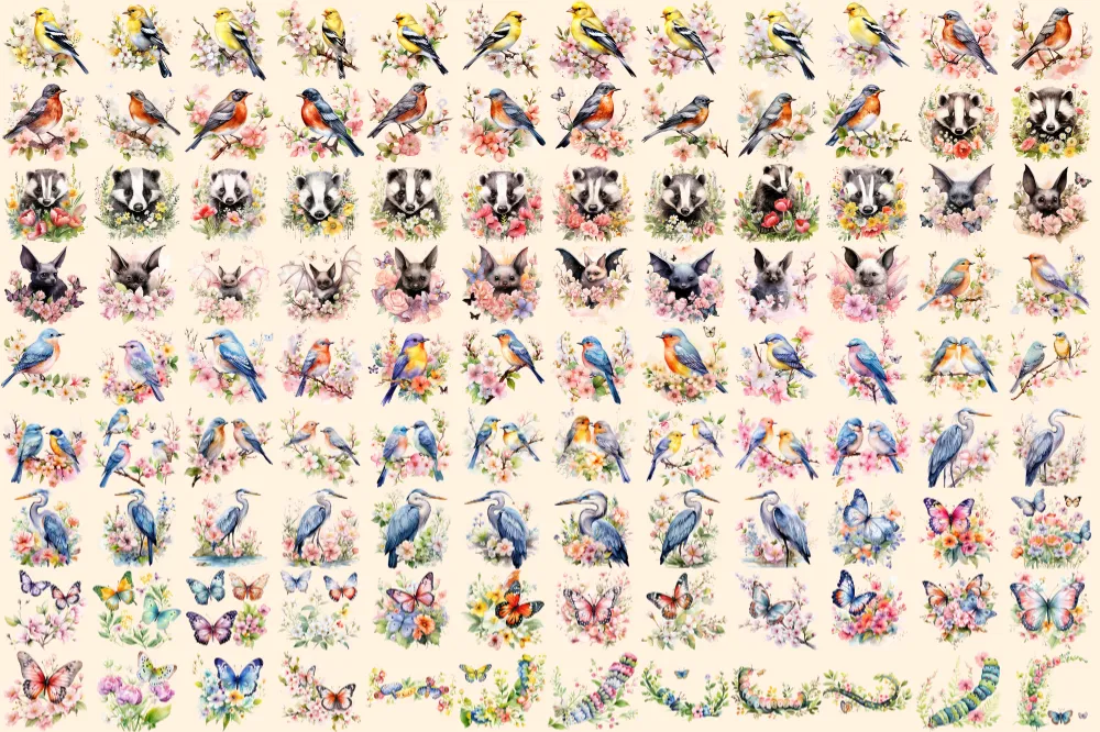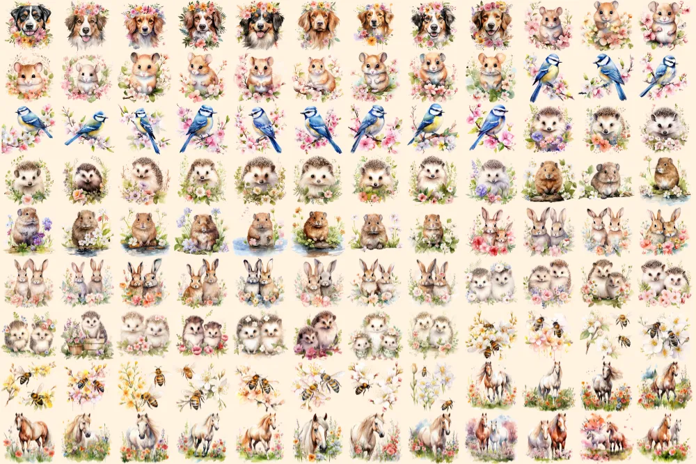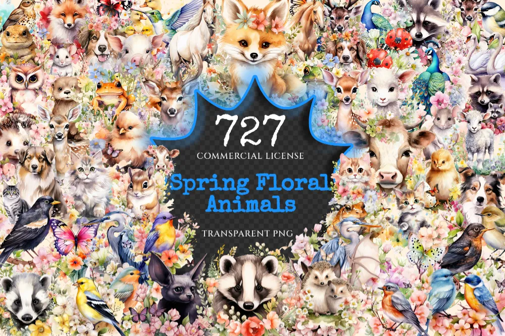 Spring Floral Animals Watercolor Clipart Bundle – 723+ transparent PNG, Spring pets graphics, Floral images, Commercial use,Digital download
