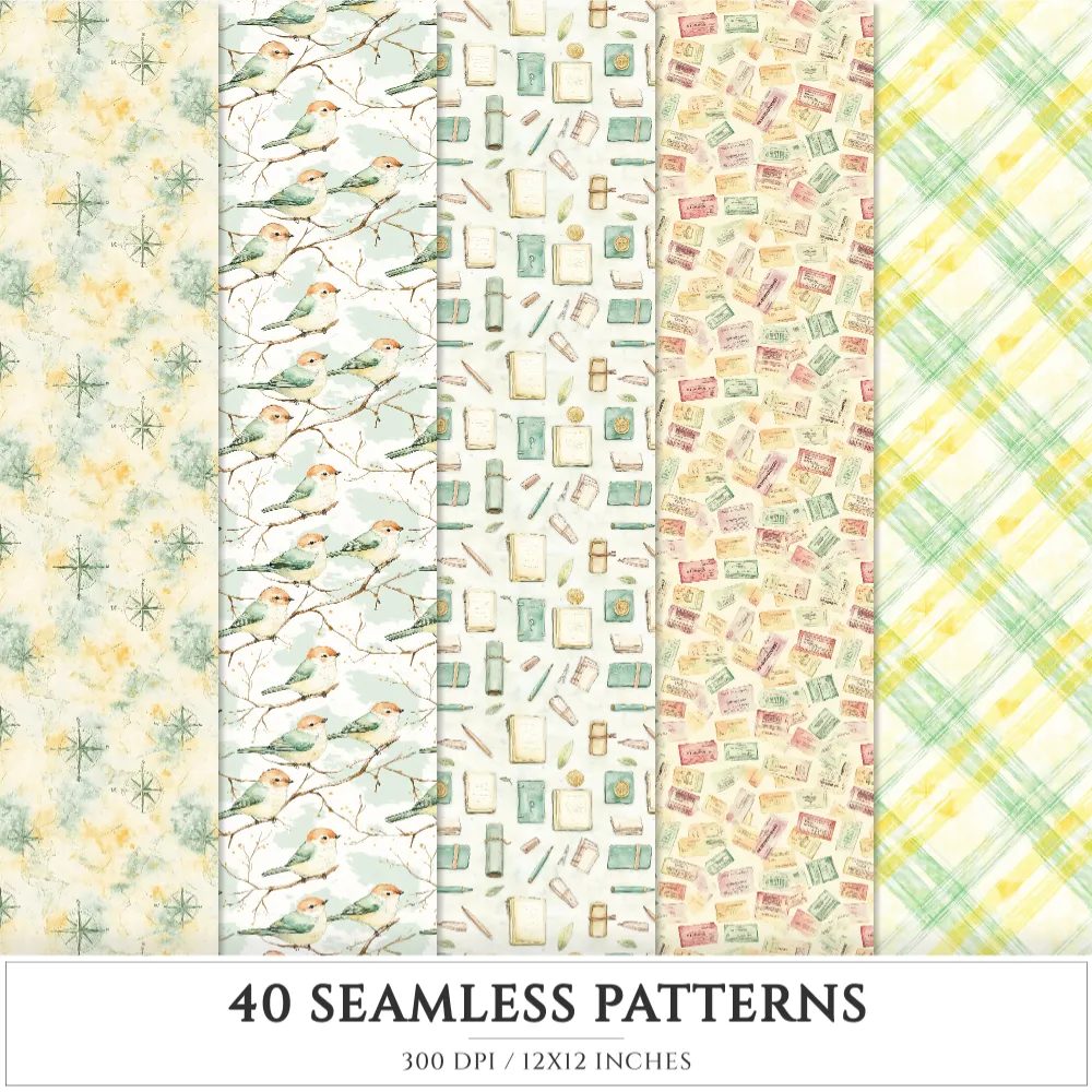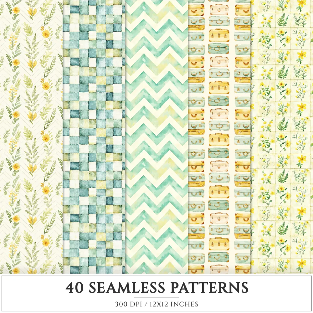 Spring Wanderlust Seamless Patterns, Spring Travel JPEG, Bicycle Pattern, Cottage, Wildflowers Repeating Pattern, Digital Scrapbook Paper
