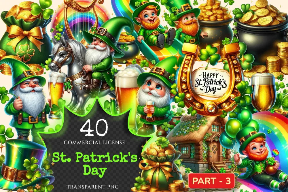 St. Patrick’s Day (P-3) PNG Clipart Collection – 40 PNG, Lucky leprechaun illustrations, Shamrock prints, Commercial use, Digital download