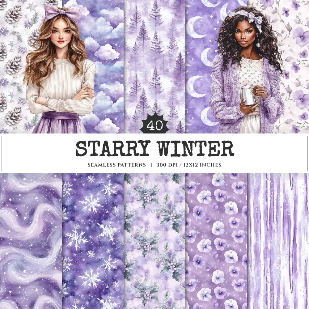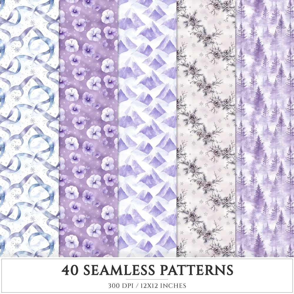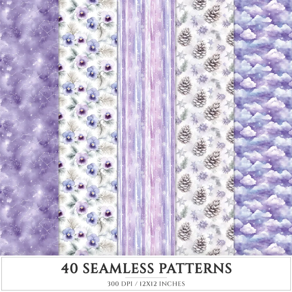 Starry Winter Seamless Patterns, Starry snowfall JPEG, Frosted pine pattern, Pansy, Snowflake repeating pattern, Digital scrapbook paper