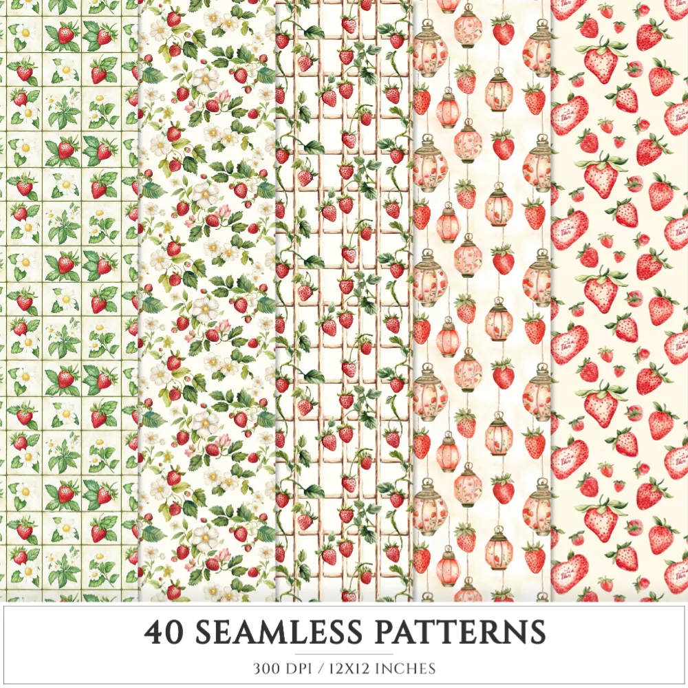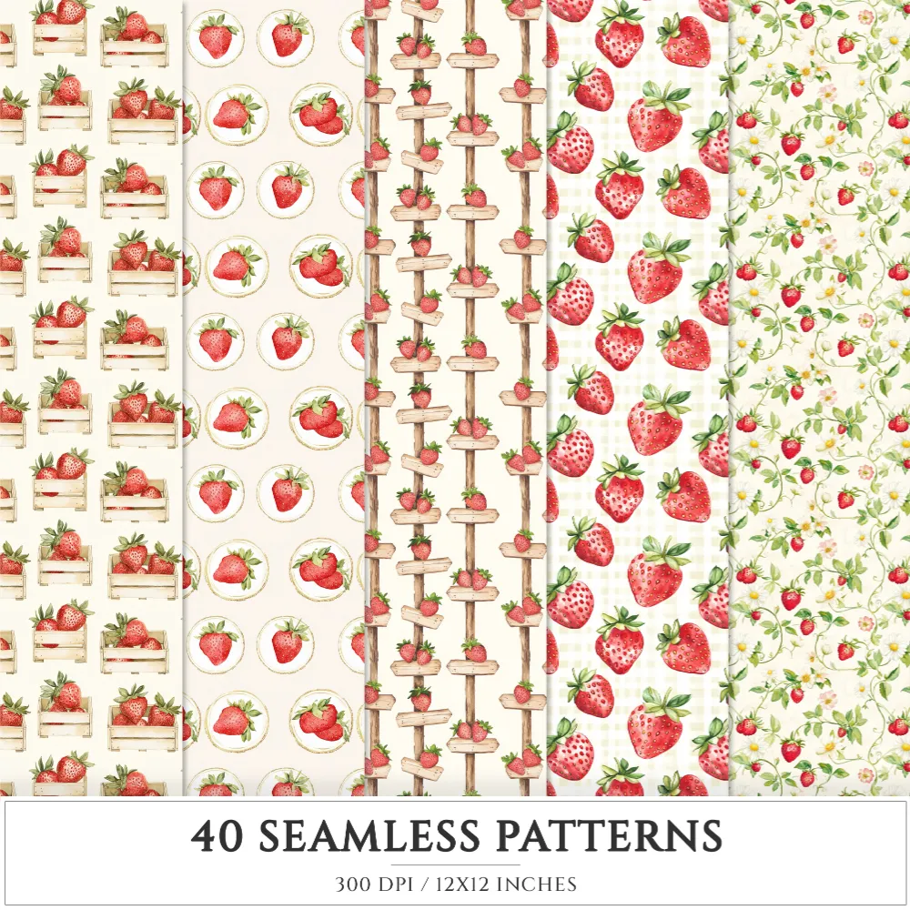 Strawberry Market Seamless Patterns, Spring Fruit JPEG, Strawberry Blossom Pattern, Fruit, Spring Repeating Pattern, Digital Scrapbook Paper