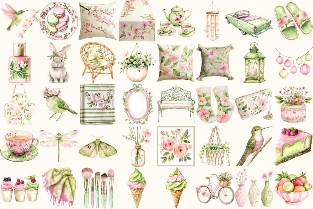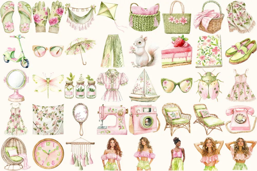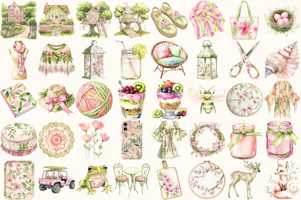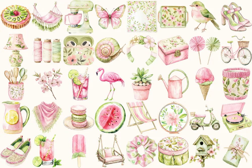 Summer Douceur Watercolor Clipart Set – 255+ transparent PNG, Stylish summer illustrations, Bloomy images, Commercial use, Digital download
