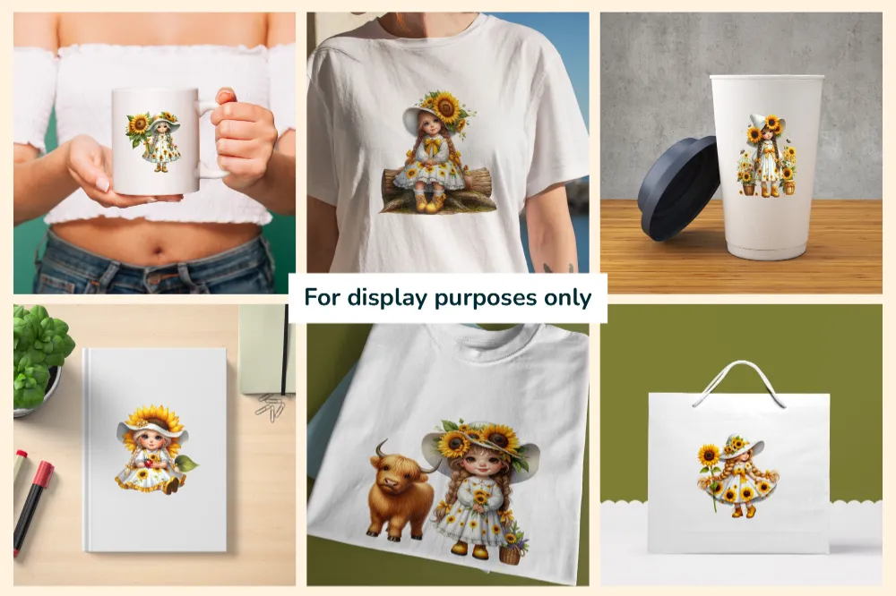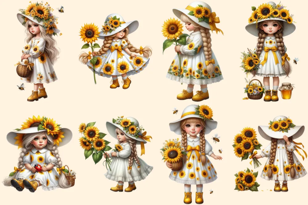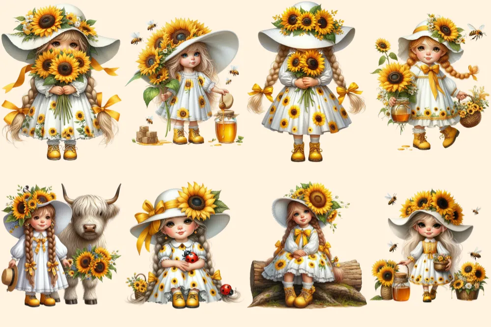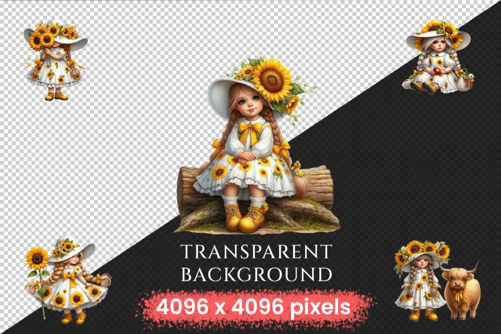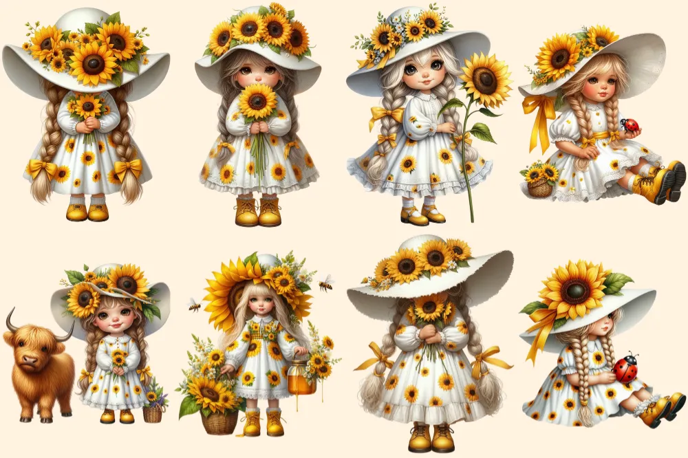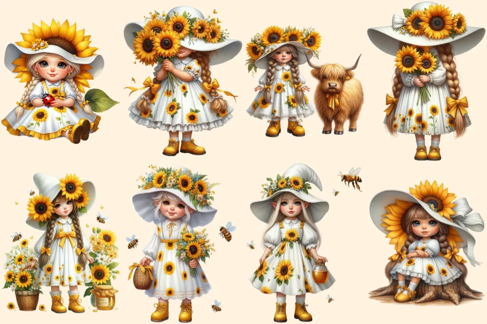 Sunflower Girl Gnomes PNG Clipart Collection – 40 PNG, Sunny gnome graphics, Sunflower printables, Commercial use, Digital download