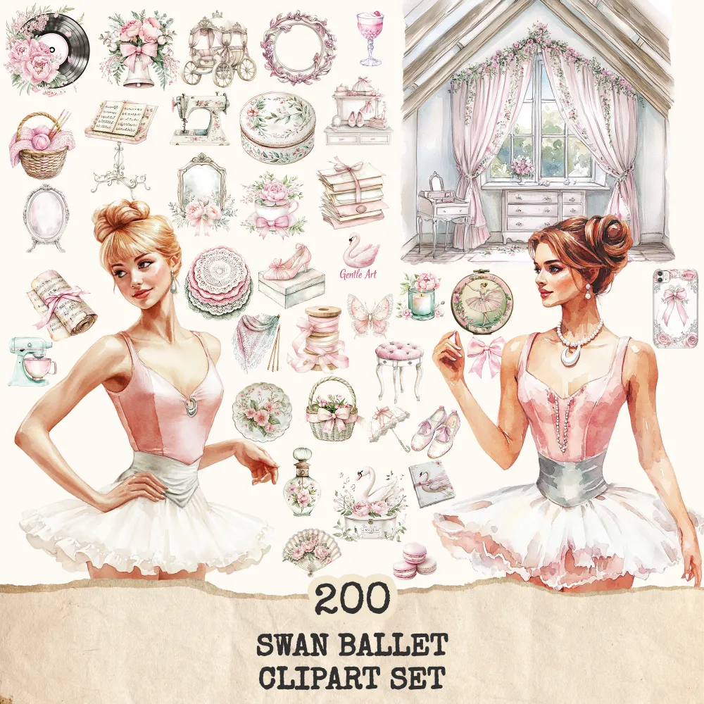 Swan Ballet Mega Bundle – Pink Ballet Dancer Printables, Ephemera, Journal, Stage Patry PNG Clipart, Seamless Pattern, Digital Download