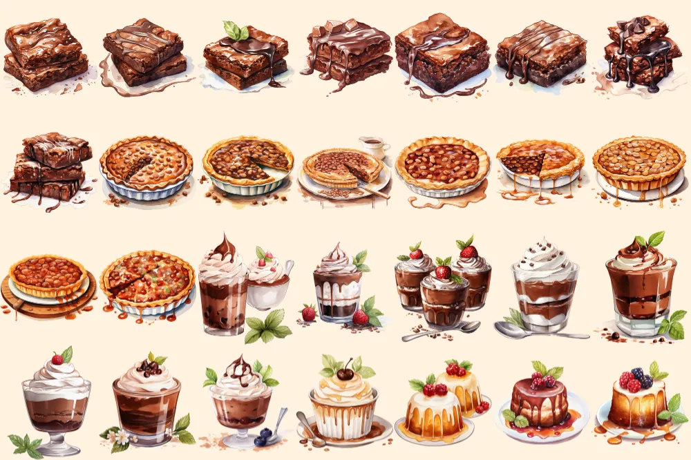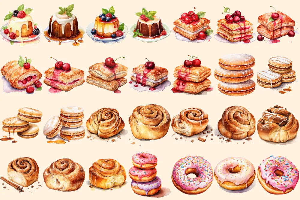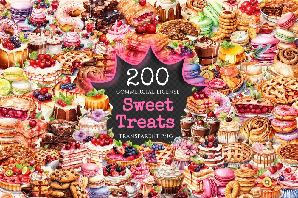 Sweet Treats Watercolor Clipart Bundle – 200 transparent PNG, Desserts, Cupcakes, Macarons, Cookies, Donuts, Commercial use,Digital download