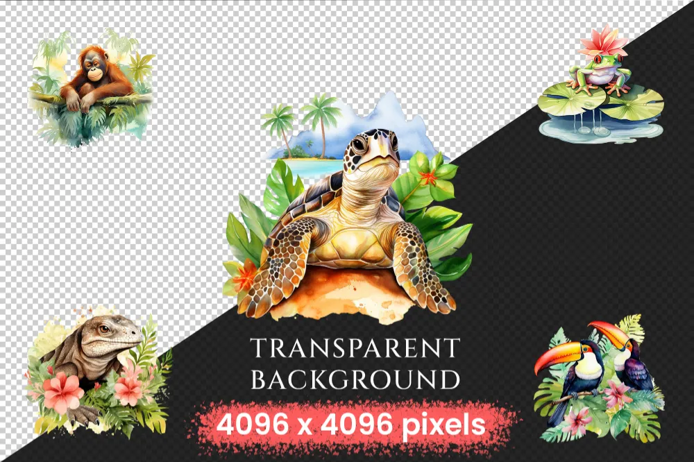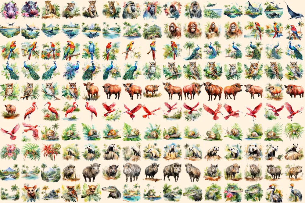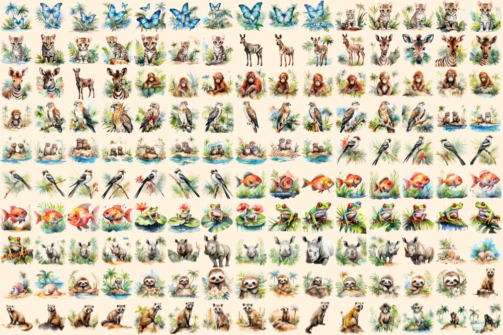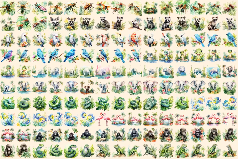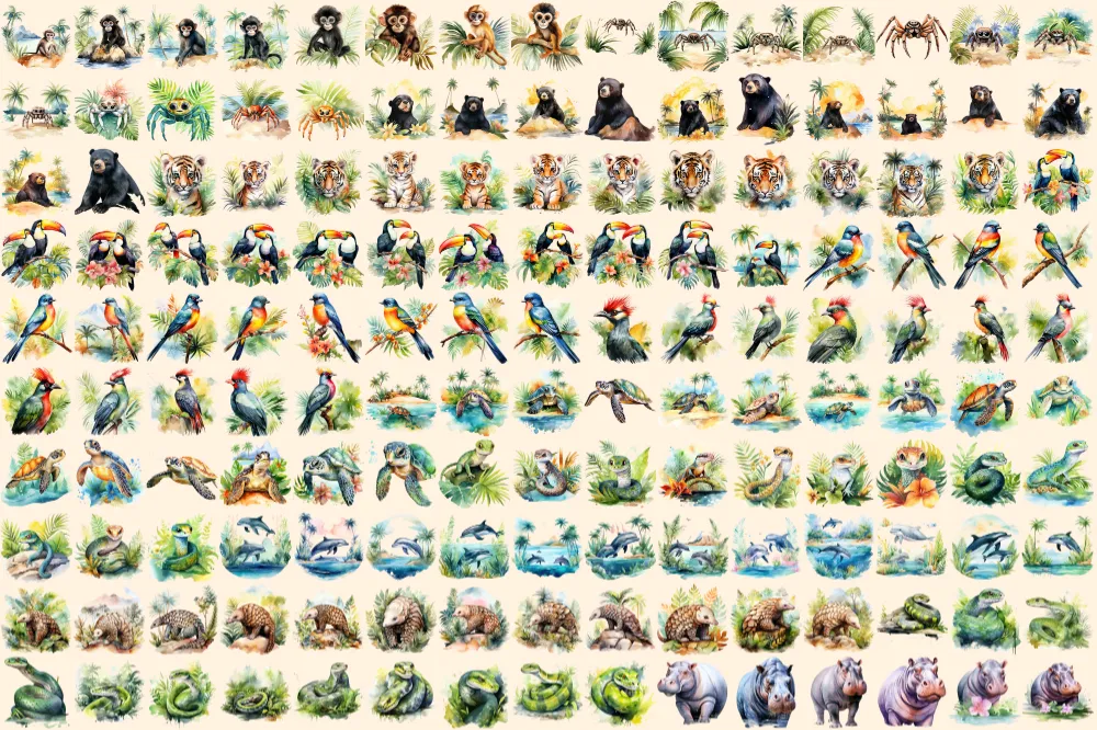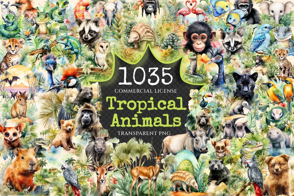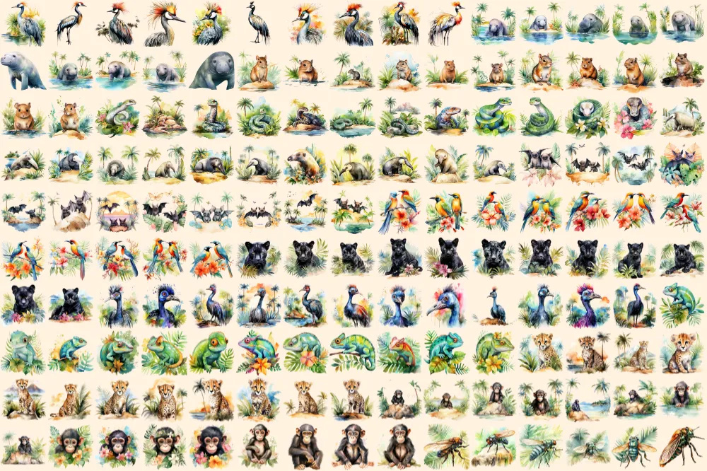 Tropical Animals Watercolor Clipart Bundle – 1030+ transparent PNG, Wild animal illustrations, Jungle png, Commercial use, Digital download