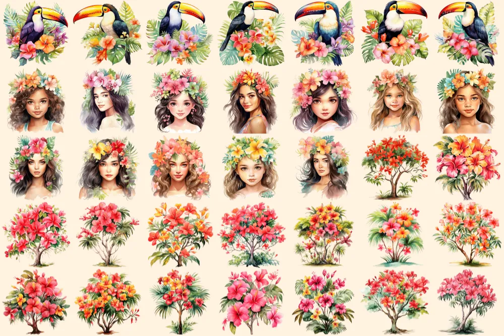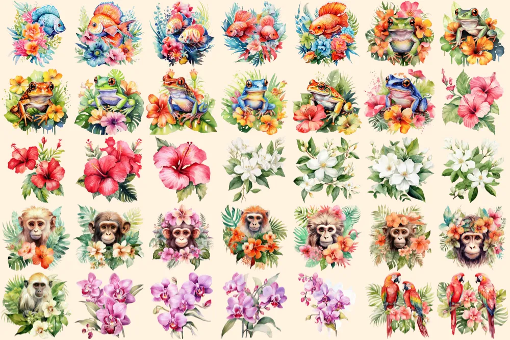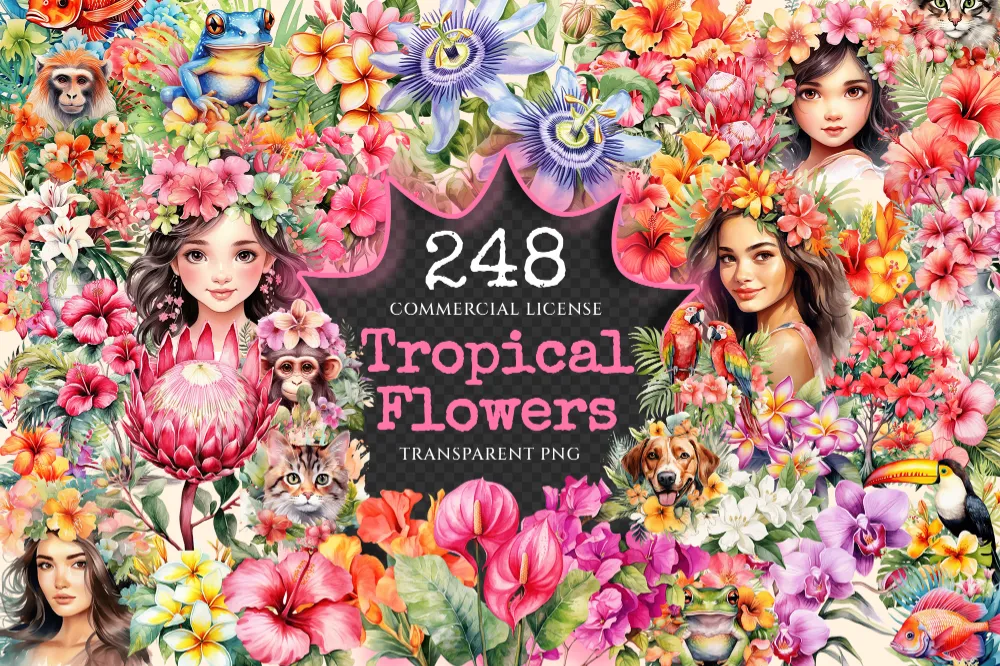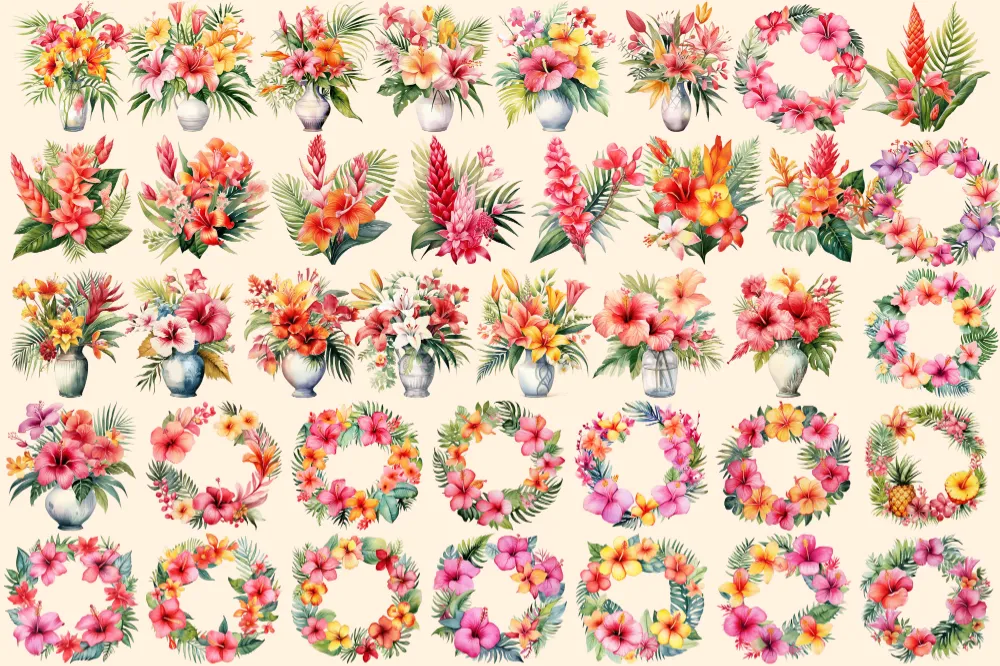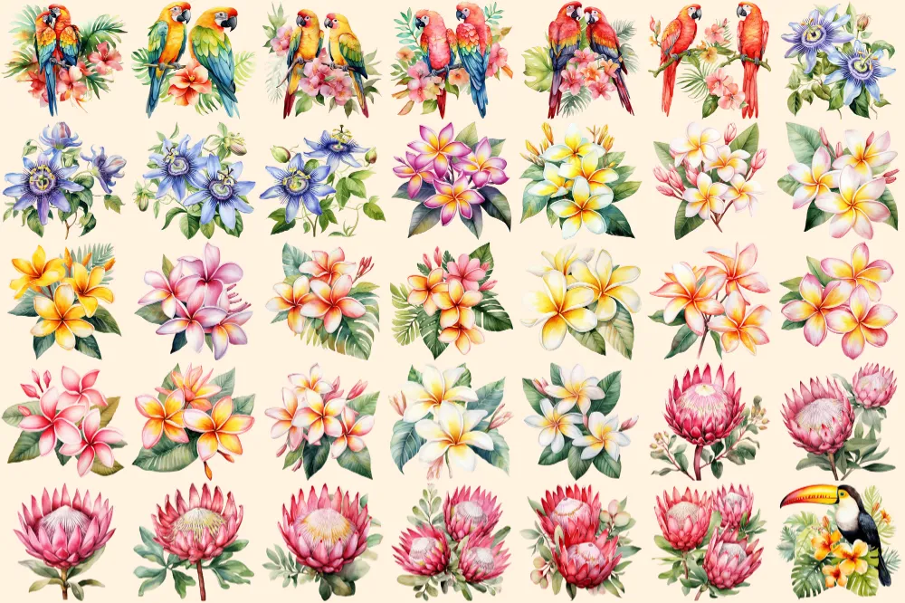 Tropical Flowers Watercolor Clipart Bundle – 245+ transparent PNG, Blooming flowers graphics, Summer png, Commercial use, Digital download