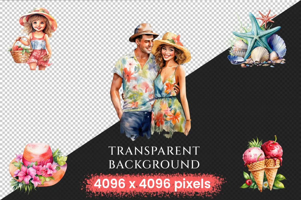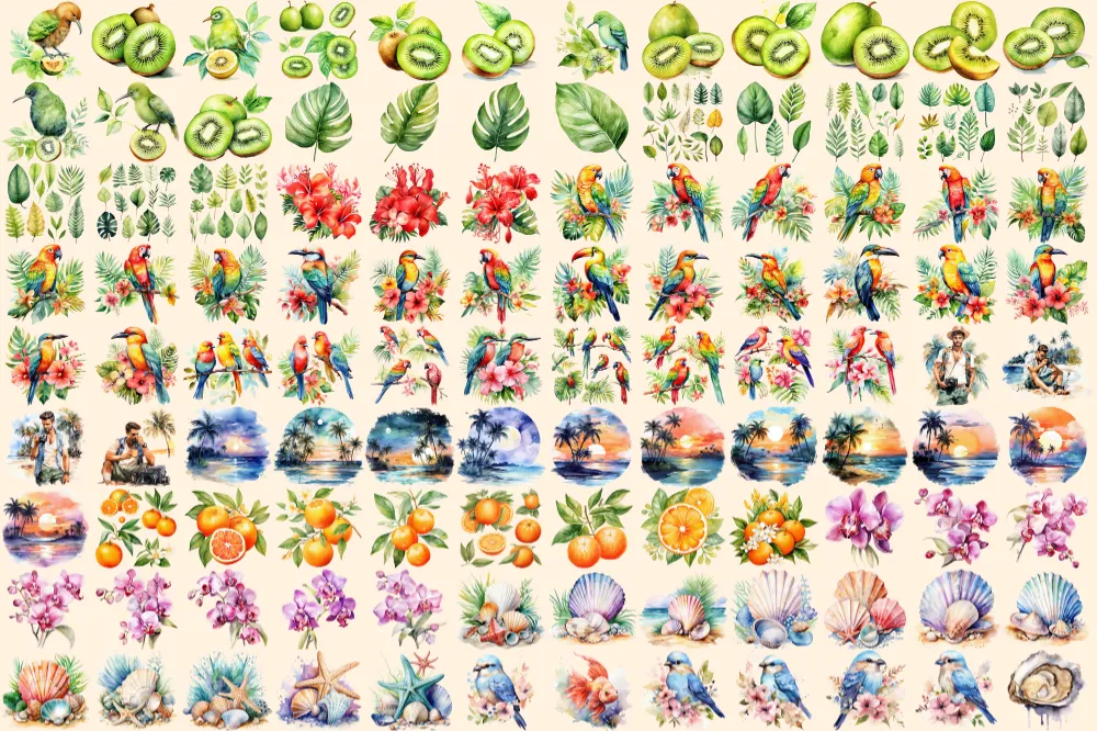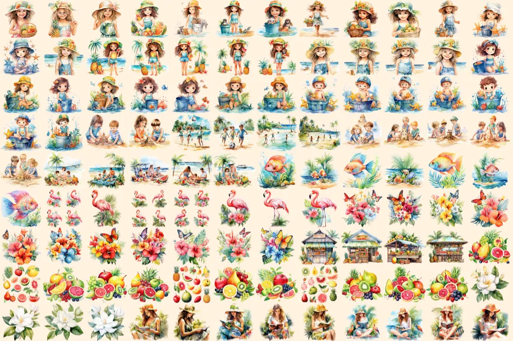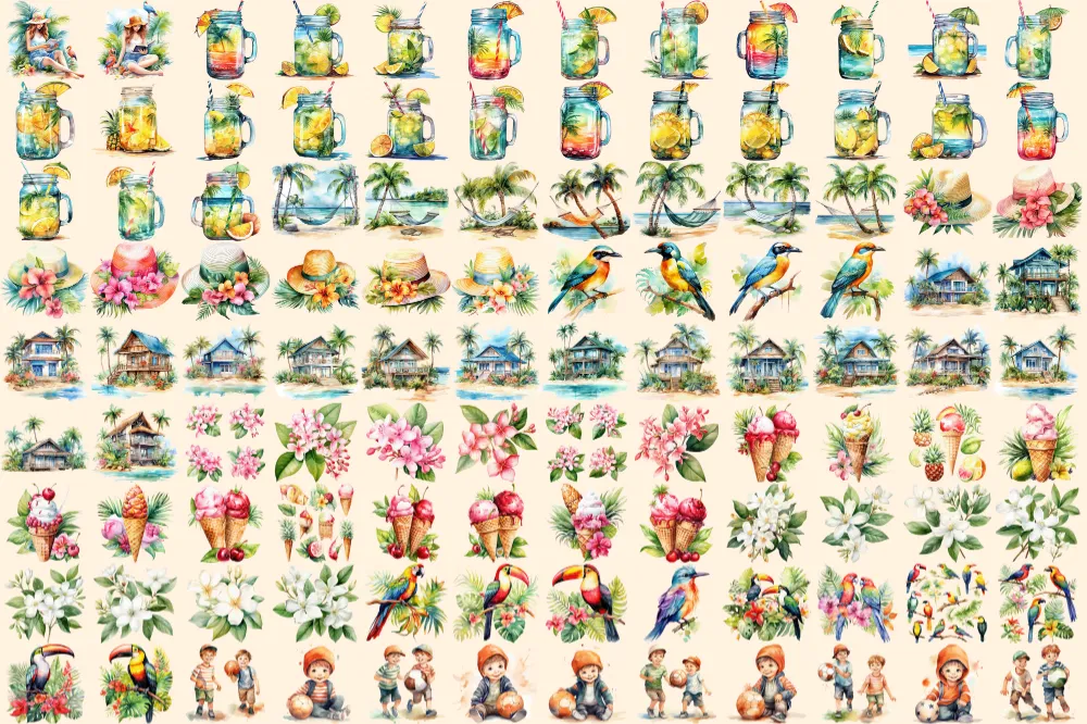 Tropical Summer Watercolor Clipart Bundle – 690+ transparent PNG, Summer clipart PNG, Summer vacation PNG Commercial use, Digital download