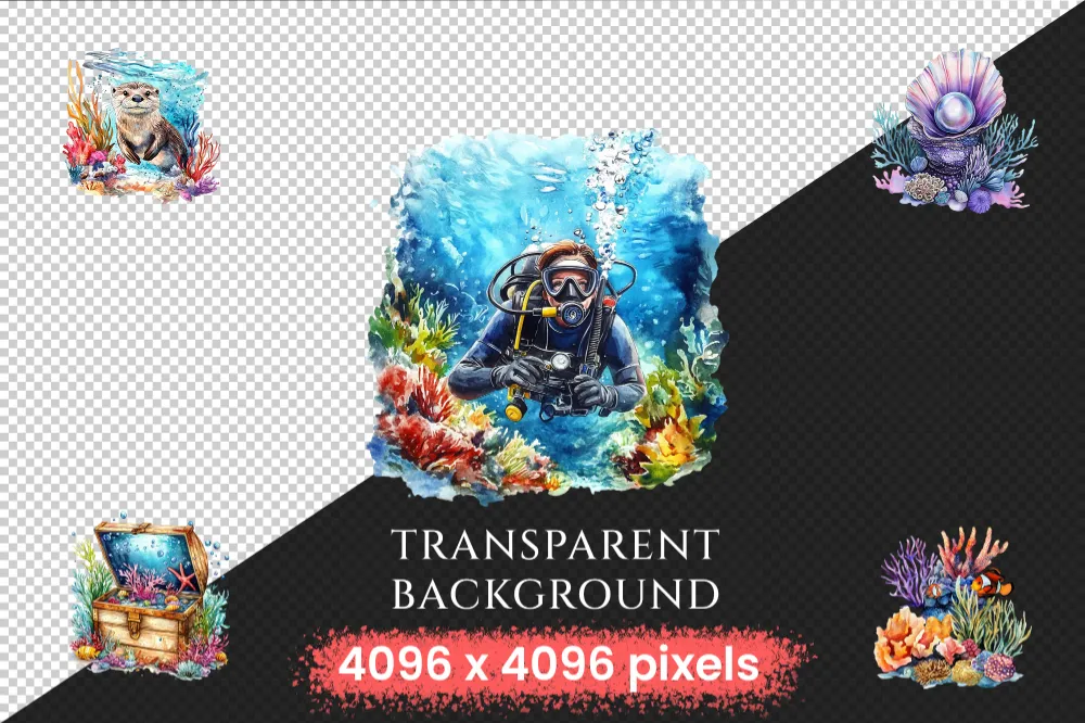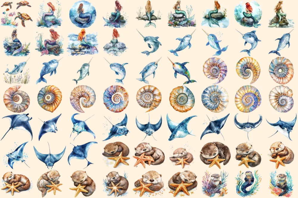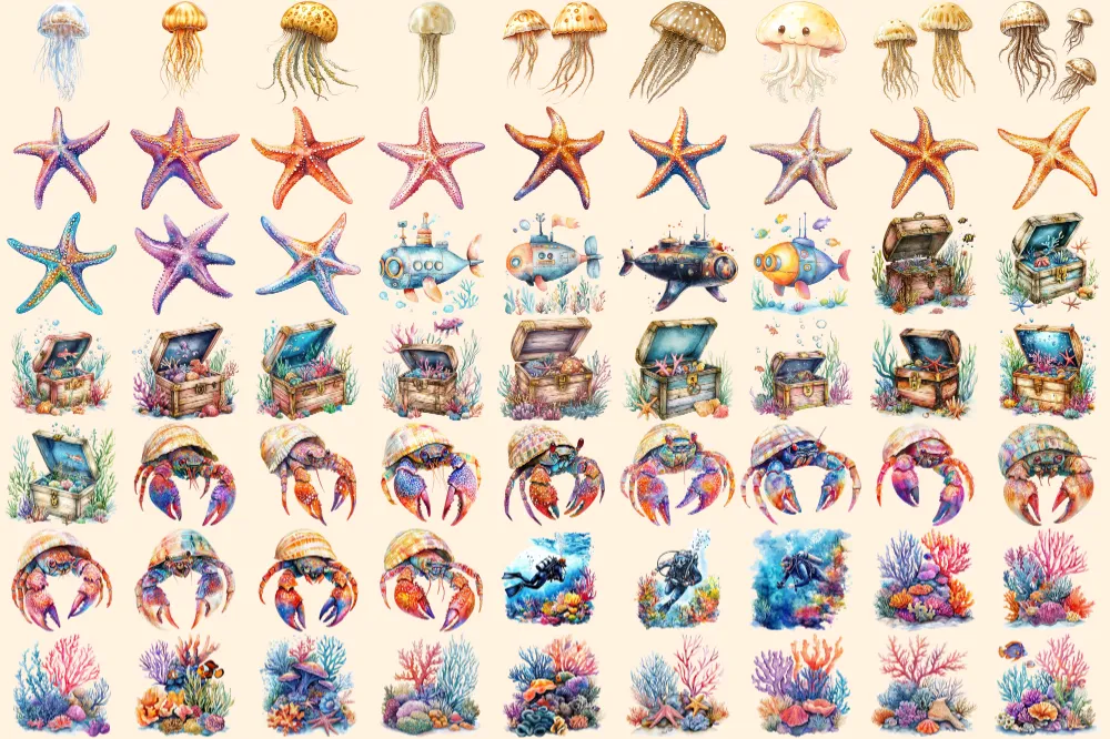 Under the Sea Watercolor Clipart Bundle – 422+ transparent PNG, Ocean life graphics, Marine creature art, Commercial use, Digital download