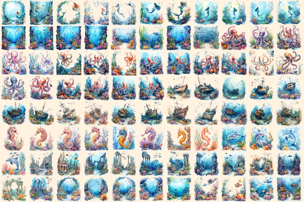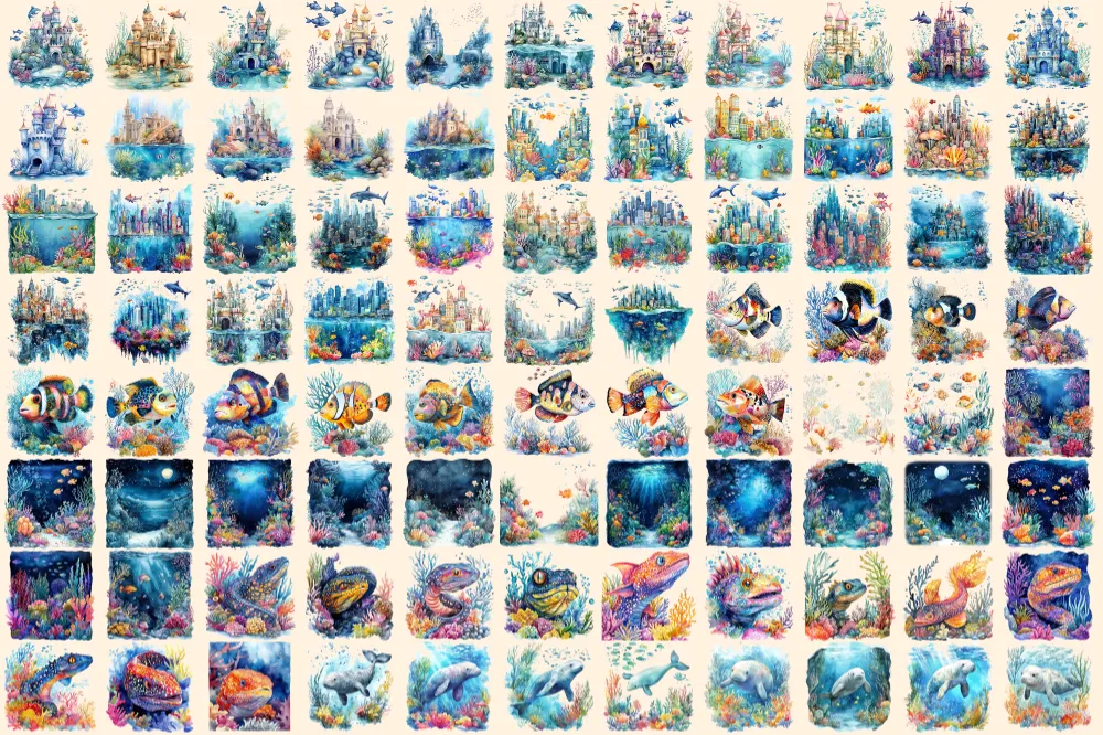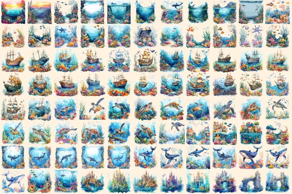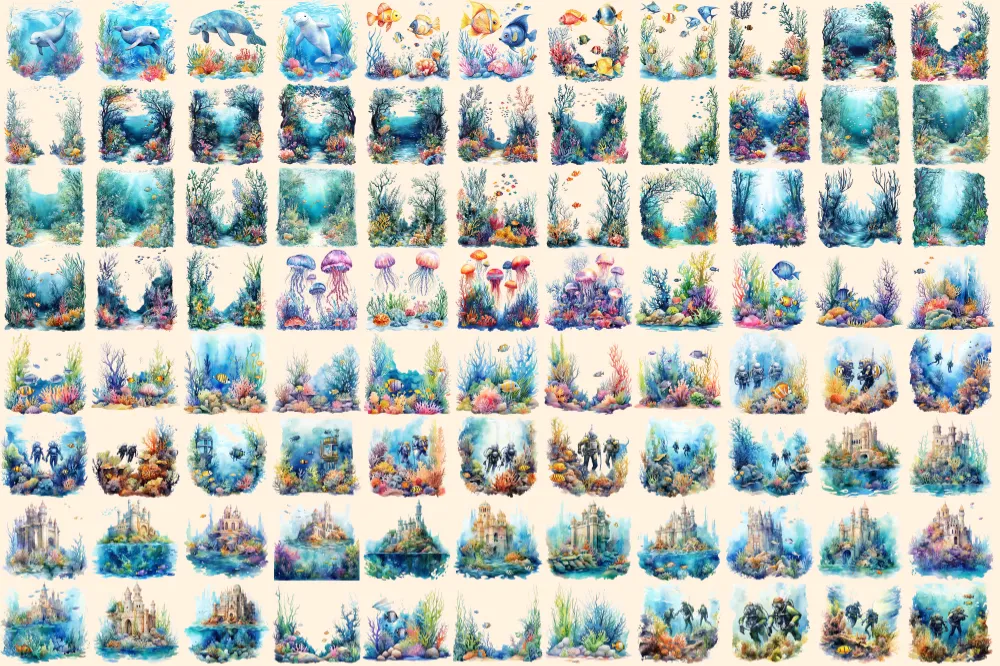 Underwater Watercolor Clipart Bundle – 600+ transparent PNG, Underwater life illustrations, Seascape png, Commercial use, Digital download