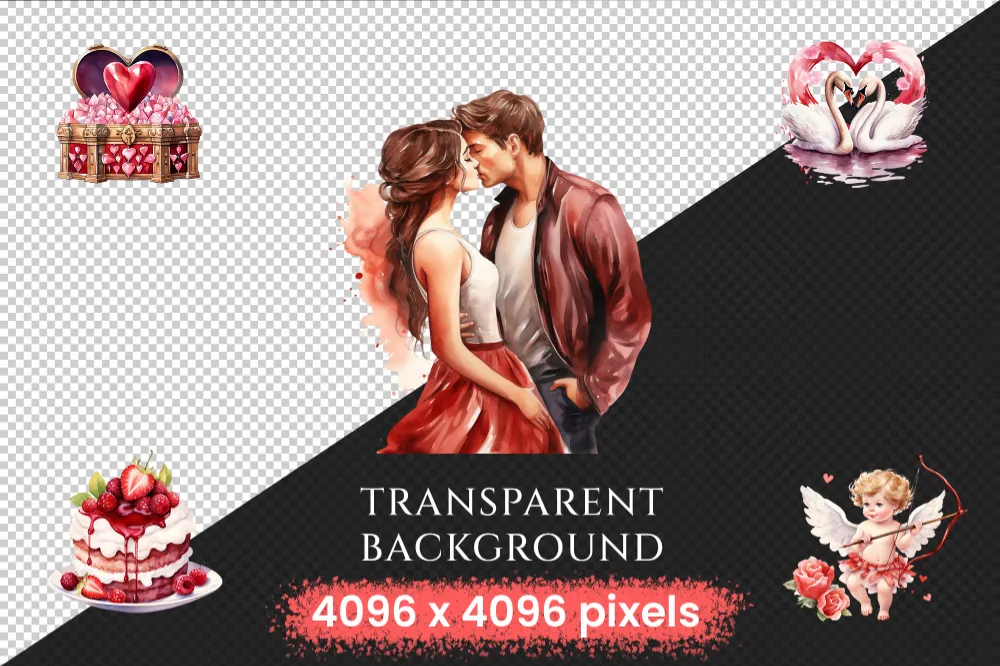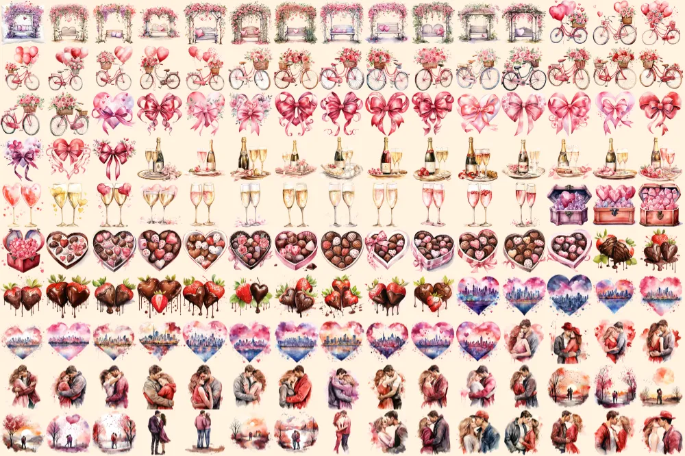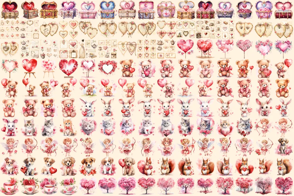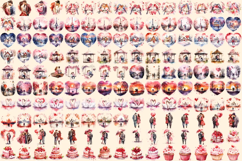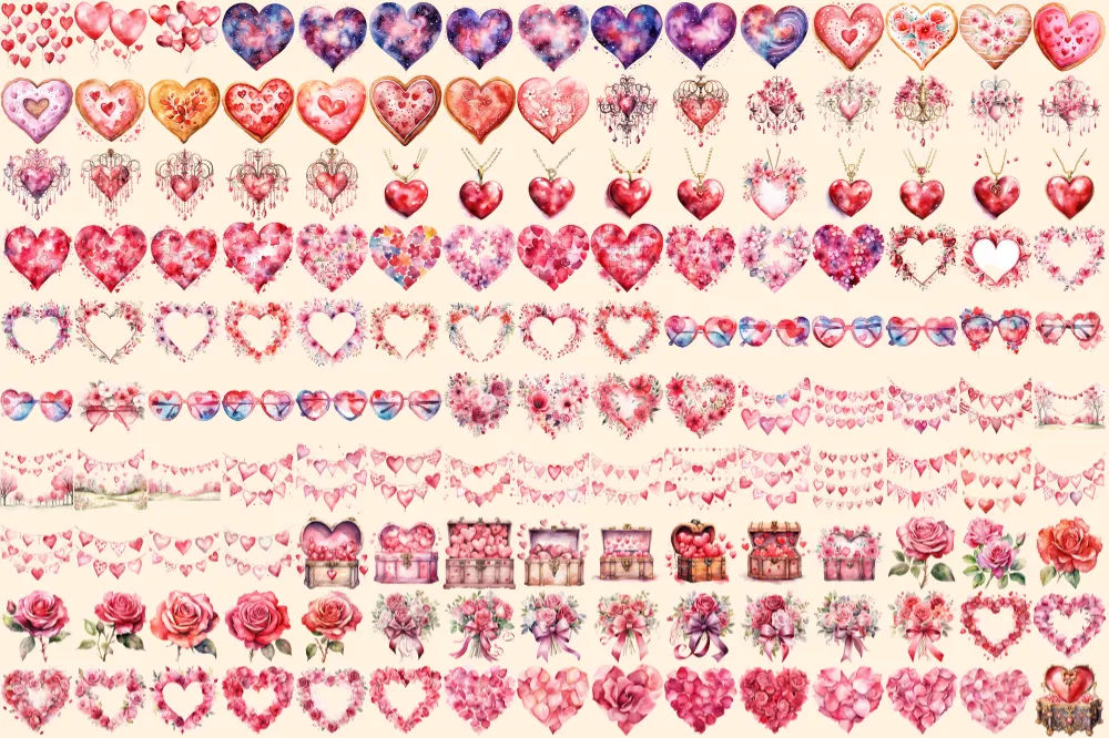 Valentine’s Day Watercolor Clipart Bundle – 1000+ transparent PNG, Charming heart illustrations, Love png, Commercial use, Digital download