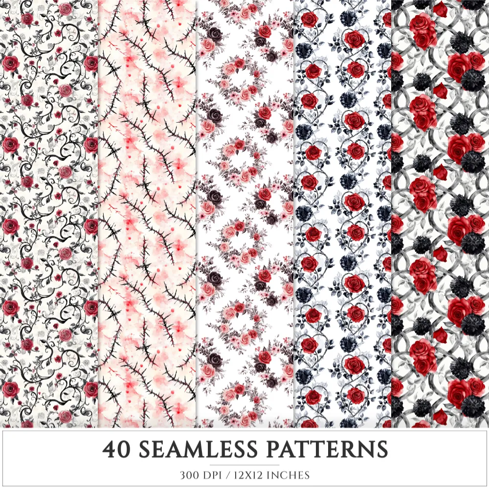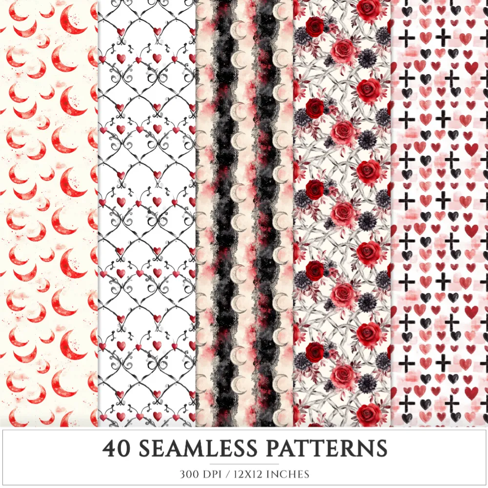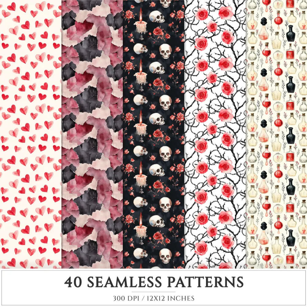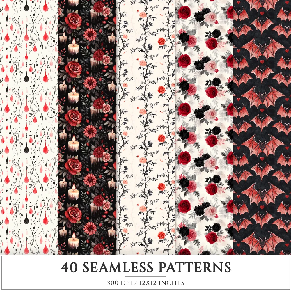 Vampire Valentine Bite Seamless Patterns, Dark Romance JPEG, Thorny Infinite Pattern, Floral Skull Repeating Pattern,Digital Scrapbook Paper