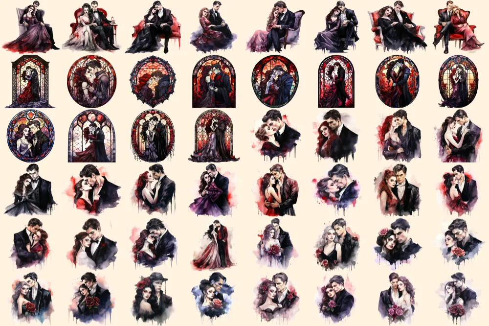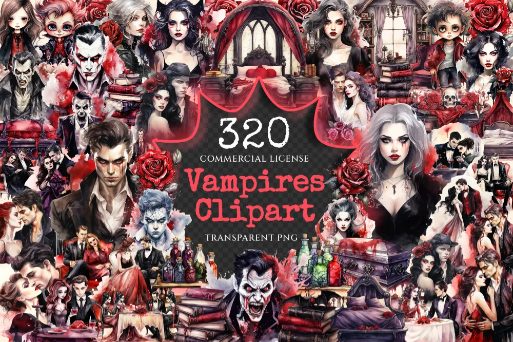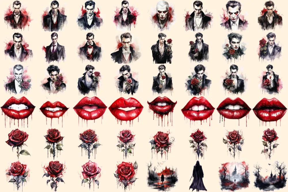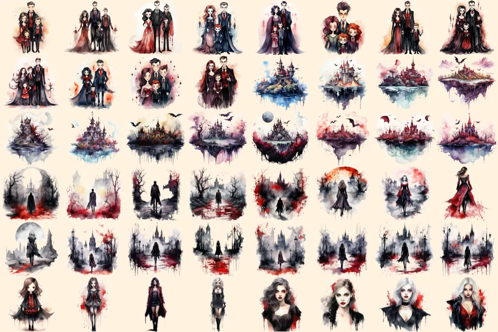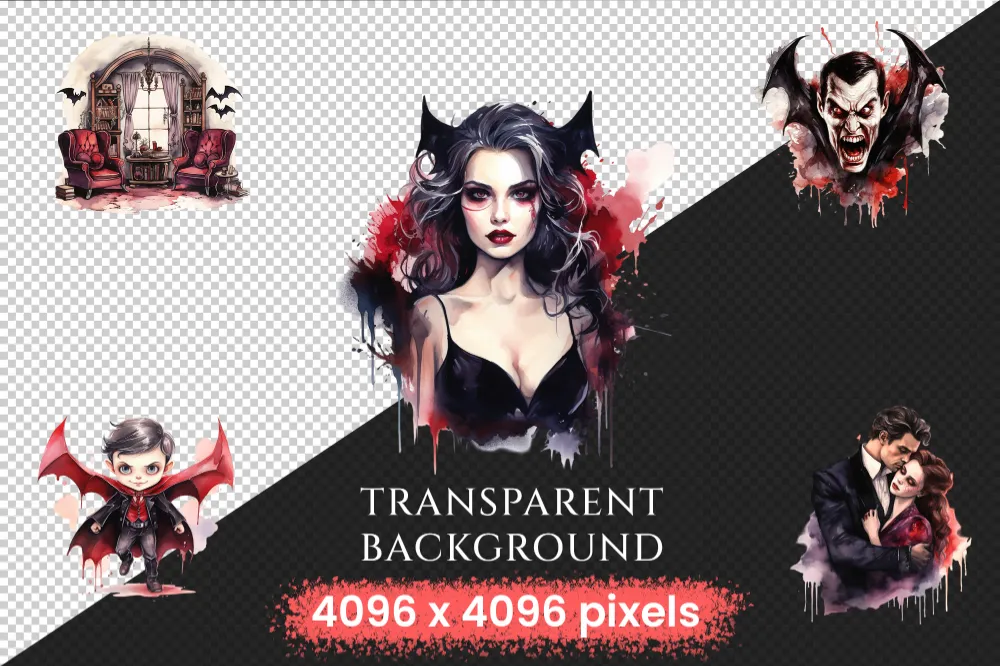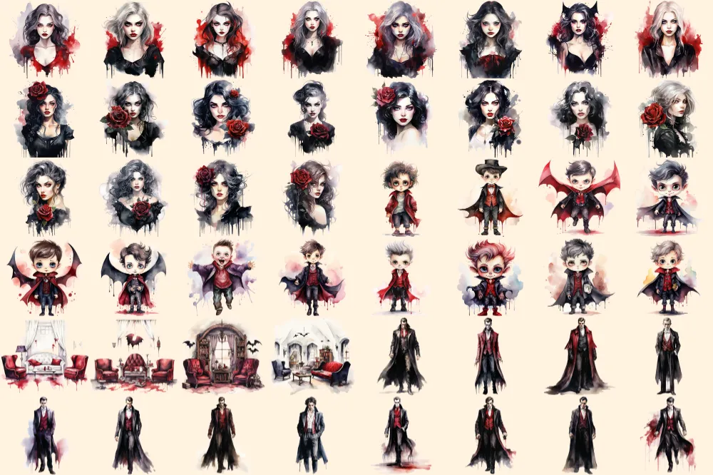 Vampires Watercolor Clipart Bundle – 315+ transparent PNG, Vampire illustrations, Haunting gothic beings, Commercial use, Digital download